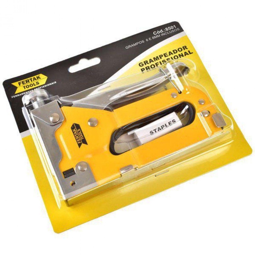 Grampeador de Tapeceiro Profissional 4 mm a 14 mm Fertak - O grampeador de tapeceiro profissional metálico é um produto muito resistente e de alta qualidade. Ideal para fixação de materiais em madeira, tais como, tecido, plástico, papel, tapeçaria, fixação de forros, telas (mosquiteiros), fixação de cartazes (escolas, supermercados, etc.), serigrafia, vitrinismo, marcenaria, cartonagem, entre outros. Além de ser compacto, leve e funcional possui controle de pressão da mola e fácil manuseio. - Compatível somente com grampos retos. Características Gerais do Produto: Espessura do grampo: 0,7 mm Cor Predominante: Amarelo Material: Aço Marca: Fertak Modelo: Alta Pressão