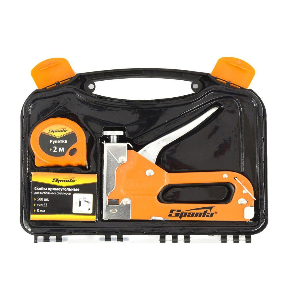 JOGO GRAMPEADOR COM AJUSTE DE PRESSAO, TRENA 2 M, COM 500 GRAMPOS TIPO 53 DE 6 - 14 MM SPARTA Referência: 42003 A principal distincao deste jogo e que contem uma trena. Trabalhando com grampeador de tapeceiro muitas vezes ha necessidade de medicao, e este jogo universal permite armazenar todo necessario numa caixa. O jogo e embalado numa caixa de plastico com uma tampa transparente. O jogo contem grampeador de tapeceiro de metal, trena de medicao (2m) e 500 grampos de tipo 53. Ajuste de pressao suave. Grampeador e usado para trabalhos de estofamento de moveis, construcao de armarios e outro. com Trena 2M, 500 Grampos e Maleta. Sparta Ideal para trabalhos de tapeçaria onde é necessário armazenar materiais pequenos. Indicado para trabalhos de estofamento de móveis, construção de armários e outro. Informações: Grampos compatíveis tipo 53 de 6 a 14mm; Compacto e funcional corpo fabricado em aço; Punho: Emborrachado; Possui design ergonômico; Peso leve e de fácil operação; Maleta reforçada com display; Acompanha Trena 2m e 500 Grampos;Com Regulagem de Pressão. Itens inclusos: - 1 Grampeador tapeceiro - 1 Maleta reforçada - 1 Trena 2m - 500 Grampos