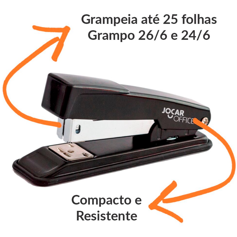 COMERCIAL VIPASA DISTRIBUIDORA. GRAMPEADOR METAL P/ ESCRITORIO METAL 11,5CM 25FLS . Grampeador Metal 11,5cm 93013 JOCAROFFICE Esse modelo possui uma estrutura em aço totalmente reforçado. Trabalhe com equipamentos de qualidade e aumente muito mais sua produtividade. A melhor opção para escritórios, escolas ou até mesmo para ter em sua casa. Especificações: - Com trilho cromado. - Capacidade para até 100 grampos 26/6. - Grampeia até 20 folhas com grampos 26/6. - Grampeia até 25 folhas com grampos 24/6. - Grampos: 24/6- 26/6. Itens inclusos: - 01 Grampeador Metal 11,5cm 93013 JOCAROFFICE *** Não acompanha grampos*** COMERCIAL VIPASA DISTRIBUIDORA.