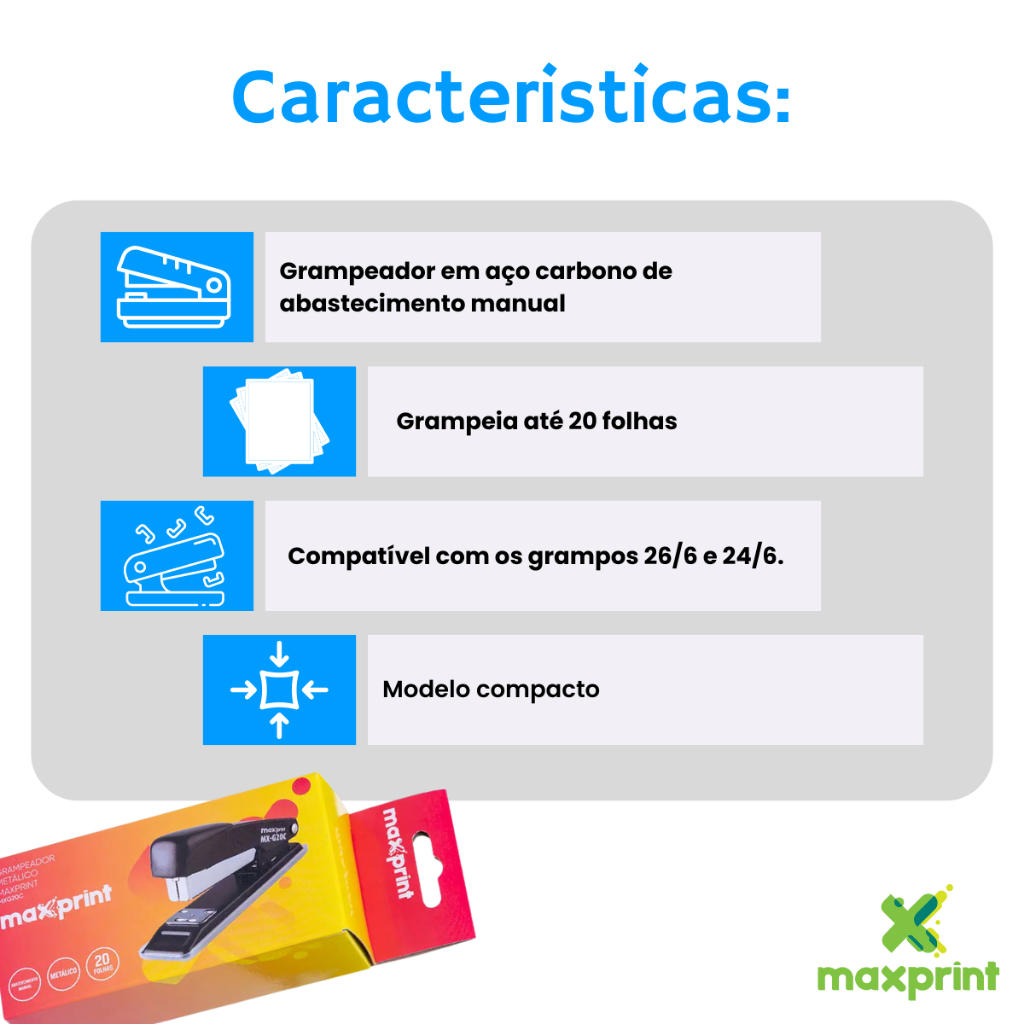 | Grampeador Metálico Compacto Escolar E Escritório Mx-g20c Capacidad... este produto | R$ 17,17 | 31% | 5.0/5 | 7 |