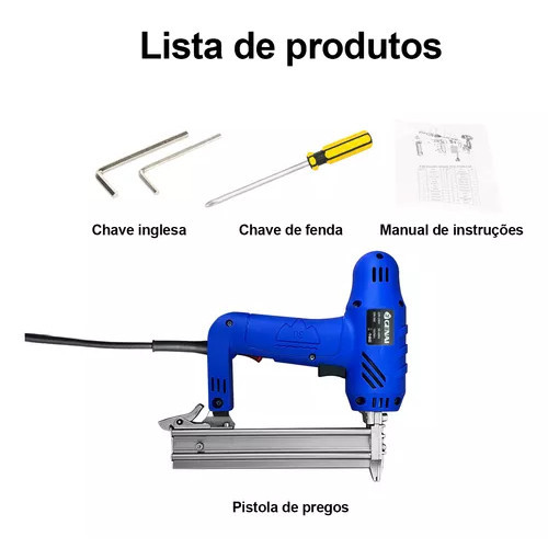Grampeador Pinador Pistola de pregos Eletrico Madeira Tapeçaria Estofados 220V Profissional Comprimento aplicável do Grampo: 15-30 cm A Pistola Elétrica Profissional é uma ferramenta robusta e de alto desempenho, ideal para quem busca praticidade e eficiência na pregagem de trabalhos em vários materiais, como madeira, plásticos e outros. Com potência elétrica e design profissional, é perfeito para aplicações que exigem energia e velocidade. Aqui está uma descrição detalhada do produto Características principais Potência Elétrica: a pistola de unha é alimentada por uma tomada de 220V, fornecendo potência suficiente para tiros rápidos e consistentes. Alta Performance e eficiência: Com o motor de alta capacidade, a pistola fornece alta potência, capaz de fotografar unhas com precisão e esforço, mesmo em materiais mais densos ou espessos. Design Profissional: A pistola é projetada para uso profissional, com corpo ergonômico que garante conforto e controle durante o uso prolongado. Seu design leve e bem equilibrado permite que o operador trabalhe com mais agilidade e menos fadiga. Dedo preciso: Equipado com um sistema de queima preciso, o prego oferece excelente controle para dirigir unhas em várias superfícies. Pode ser usado em diversos tipos de construção, montagem e reparo. Seguro e Prático: O aparelho inclui sistemas de segurança, como trava de gatilho para evitar queima acidental, garantindo que o usuário possa operar com confiança.