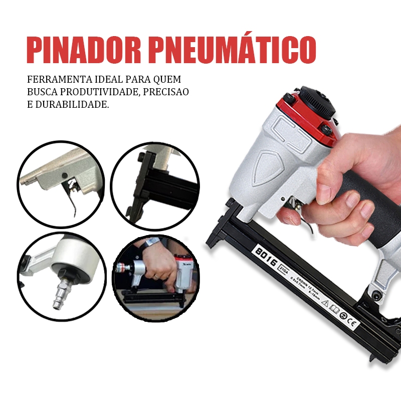 Modelo:8016 Corpo em alumínio fundido, resistente e leve Acionador em aço inoxidável temperado para maior durabilidade Pressão necessária: 50-100 PSI (4-7 BAR) Capacidade do carregador: 100 peças Entrada de Ar: 1/4" Tipo de Prego: 21GA (0,96*0,65 mm) Largura do Prego: 12,7 mm Este grampeador é essencial para quem busca eficiência e durabilidade em suas ferramentas. Compatível com compressores de ar (não inclusos), é uma excelente escolha para profissionais exigentes.