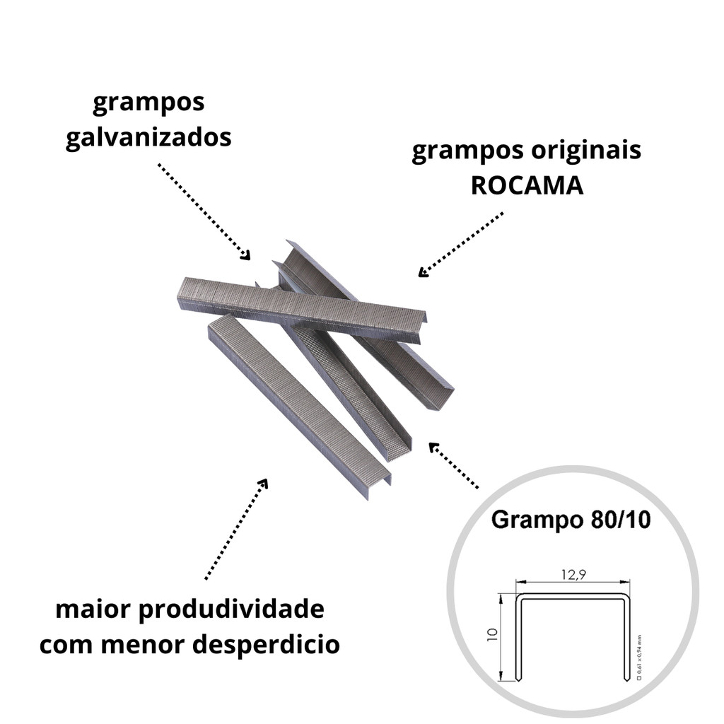 Grampo 80/10 Galvanizado Rocama (caixa c/ 4000 grampos) Medidas do Grampo:Largura: 12,9 mmAltura: 10 mm Grampos originais ROCAMA Os grampos Rocama são produzidos com alto padrão de qualidade e excelência, pensando em reduzir o desperdício dos grampos e aumentar a sua produtividade e seus lucros.Utilize sempre grampos originais Rocama para manter a produtividade e a longevidade do seu grampeador. Utilizado no grampeador e pinador Rocama: 80/F Aplicações: Tapeçaria, Móveis, Estofados, Capotaria, Silk Screen, Janelas, Caixas, Artesanatos, Vassouras, Pincéis, Decoração de Festas, etc. O grampo 80/10 Rocama também pode ser utilizado nos grampeadores pneumáticos: - Rocama 80W - Pacar 80/16 Brasileirinho - Pacar PI-80/16 Automático - Pacar 80/16 Brasileirinho p/ Forro PVC- Pacar 80/W TG - Pacar PI-80/16 C - Pacar PI-80/16 Automático TL - Pacar 80/W TL - Imeco Multigramp M3- Imeco Prátiko 3001 - Imeco Compacto 80/16 - Air Fix 80/16 A- Ultra 80/16 Fire - Filetto FTO-8016- Puma-AT3133 - Makita At1216az- Equipa Tools 80/16 Pro - Furio 8016 Pro E todos os outros grampeadores compatíveis com grampos da linha 80 Se ficou alguma dúvida nossa equipe pode te ajudar, será um prazer responder a sua pergunta.