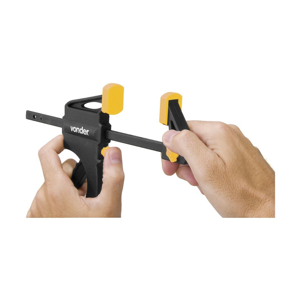 Ideal para fixar peças em processos de colagem, fixação, montagem de móveis, carpintaria, entre outros. Não utilizar para sustentação. O Grampo Tipo Sargento de Aperto Rápido 8" (203 mm) GA308 da Vonder é uma ferramenta essencial para quem busca eficiência e praticidade em trabalhos de marcenaria e montagem. Com um design robusto e resistência superior, este grampo permite um ajuste rápido e preciso, garantindo firmeza e segurança durante o uso. Produzido em plástico rígido ABS de alta resistência. Possui sistema de aperto rápido, proporcionando praticidade na aplicação. Conteúdo da Embalagem: 1 Grampo tipo sargento. Detalhes técnicos: Modelo: GA 308 Capacidade máxima de abertura: 8" - 203 mm Material da haste do grampo: Metal Material do cabo do grampo: Plástico Massa aproximada (peso): 0,22 kg