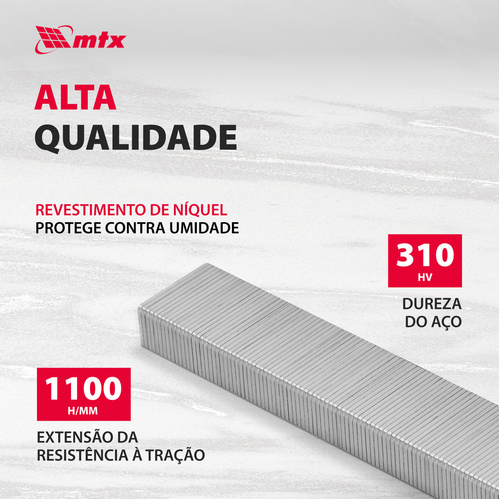 Os Grampos retangulares MTX 576649 tipo 20GA, com sua generosa quantidade de 5000 unidades por embalagem, são a escolha ideal para profissionais e entusiastas do faça-você-mesmo que buscam uma solução de fixação de alta qualidade e durabilidade. Projetados para serem utilizados com grampeadores pneumáticos compatíveis com fixadores de seção 1,2 x 0,6 mm, comprimento de 22 mm e largura de 11,2 mm, esses grampos oferecem uma fixação segura e confiável para uma variedade de materiais, incluindo revestimentos, rodapés, isolantes, entre outros, em superfícies de madeira. Principais Vantagens: Força e Resistência à Corrosão: Os grampos são fabricados a partir de aço de alta qualidade, com uma dureza de 310 HV, garantindo uma força excepcional e um limite de resistência à tração de 1100 N/mm^2. O revestimento protetor aplicado sobre cada grampo não apenas aumenta sua durabilidade, mas também previne a formação de ferrugem, assegurando que os grampos mantenham sua integridade e desempenho mesmo em ambientes úmidos ou em aplicações externas. Trabalho Eficiente: Projetados com pontas afiadas, esses grampos penetram com facilidade em materiais duros, permitindo uma aplicação rápida e eficiente. Esta característica é especialmente valiosa para projetos que exigem uma grande quantidade de fixação, pois reduz significativamente o tempo e o esforço necessários para completar o trabalho. Embalagem Bem Pensada: A embalagem inovadora dos grampos, que os mantém colados em blocos, minimiza a dispersão dos fixadores e facilita o manuseio durante o trabalho. Além disso, com 5000 unidades por embalagem, os usuários desfrutam de um suprimento amplo, reduzindo a necessidade de reabastecimento frequentes e garantindo que os materiais necessários estejam sempre à mão para a conclusão dos projetos. Os Grampos retangulares MTX 576649 tipo 20GA são, portanto, uma solução de fixação superior para uma ampla gama de aplicações, oferecendo uma combinação inigualável de força, resistência à corrosão e eficiência. Seja para fixação de revestimentos, instalação de rodapés, isolamento de paredes ou outros trabalhos em madeira, esses grampos garantem uma fixação segura e duradoura, apoiando profissionais e entusiastas do DIY em seus projetos mais desafiadores. A embalagem cuidadosamente projetada e a qualidade excepcional dos grampos refletem o compromisso da MTX com a inovação e a satisfação do cliente, tornando-os uma escolha essencial para quem busca resultados profissionais e duradouros.