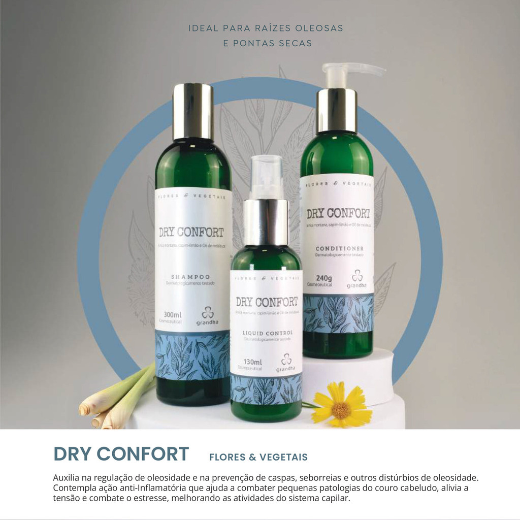 Grandha Dry Confort Shampoo 300ml e Condicionador 240g Flores e Vegetais para Raiz Oleosa e Pontas Secas Ideal para combate à oleosidade excessiva. O kit Dry Confort, da linha de terapia capilar, Flores e Vegetais, é a tradicional combinação da arnica montana, com o capim-limão, potencializados com o óleo essencial de melaleuca para raízes oleosas e pontas secas. Informações Importantes: - Não testado em animais. - Dermatologicamente testado. - Com arnica montana, capim limão e óleo essencial de melaleuca. - Cosmético fitoterápico: pode haver precipitação dos princípios ativos durante o armazenamento. Garantia do vendedor: 90 dias