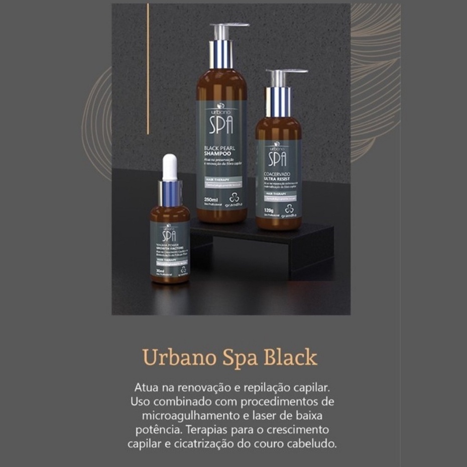 KIT URBANO SPA BLACK: O Segredo para Cabelos Mais Fortes e Saudáveis O Kit Urbano Spa Black é a solução completa para tratamentos de queda capilar. Este sistema integrado apresenta fatores de crescimento nanoparticulados que atuam em conjunto para favorecer a recuperação capilar e a biomodulação do folículo piloso. Com ação em três rotas diferentes, combate a atrofia folicular induzida pela DHT e melhora a síntese proteica. O kit contém 3 produtos essenciais: Black Pearl Shampoo (250 ml): Formulado para cabelos úmidos, este shampoo é suave e eficaz. Massageie-o suavemente e deixe-o agir por 2 minutos antes de enxaguar. Repita o processo com mais uma pausa de 2 minutos para obter melhores resultados. Coacervado Ultra Resist (120 g): Ideal para cabelos úmidos, este produto auxilia no desembaraço e fortalecimento dos fios. Massageie-o mecha a mecha e deixe agir por 10 minutos antes de enxaguar. Magma Power Growth Factors (30 ml): Este produto é aplicado diretamente no couro cabeludo levemente úmido. Massageie-o suavemente para melhor absorção e não enxágue. É perfeito para terapias noturnas, aplicando após o banho e removendo pela manhã com a lavagem normal dos cabelos. Benefícios Principais: Preservação e Renovação da Fibra Capilar: O kit promove a saúde e vitalidade dos cabelos, reparando a fibra capilar de dentro para fora. Reparação Extrema e Redensificação da Fibra Capilar: Engrossa os fios ralos e frágeis, tornando-os mais fortes e resistentes. Crescimento Capilar e Biomodulação do Folículo Piloso: Atua na promoção do crescimento dos cabelos, enquanto equilibra a saúde do folículo piloso. Sobre a Tecnologia Avançada: O Kit Urbano Spa Black utiliza a tecnologia mais avançada no tratamento de queda capilar, com fatores de crescimento nanoparticulados que otimizam os resultados. Instruções de Uso: Siga as instruções de uso fornecidas para cada produto no kit para obter o máximo benefício. Use regularmente para promover cabelos mais fortes e saudáveis. Experimente o Kit Urbano Spa Black e Redescubra a Beleza dos Seus Cabelos. Adquira o seu kit agora e aproveite os benefícios de um tratamento capilar avançado. Seus cabelos merecem o melhor!