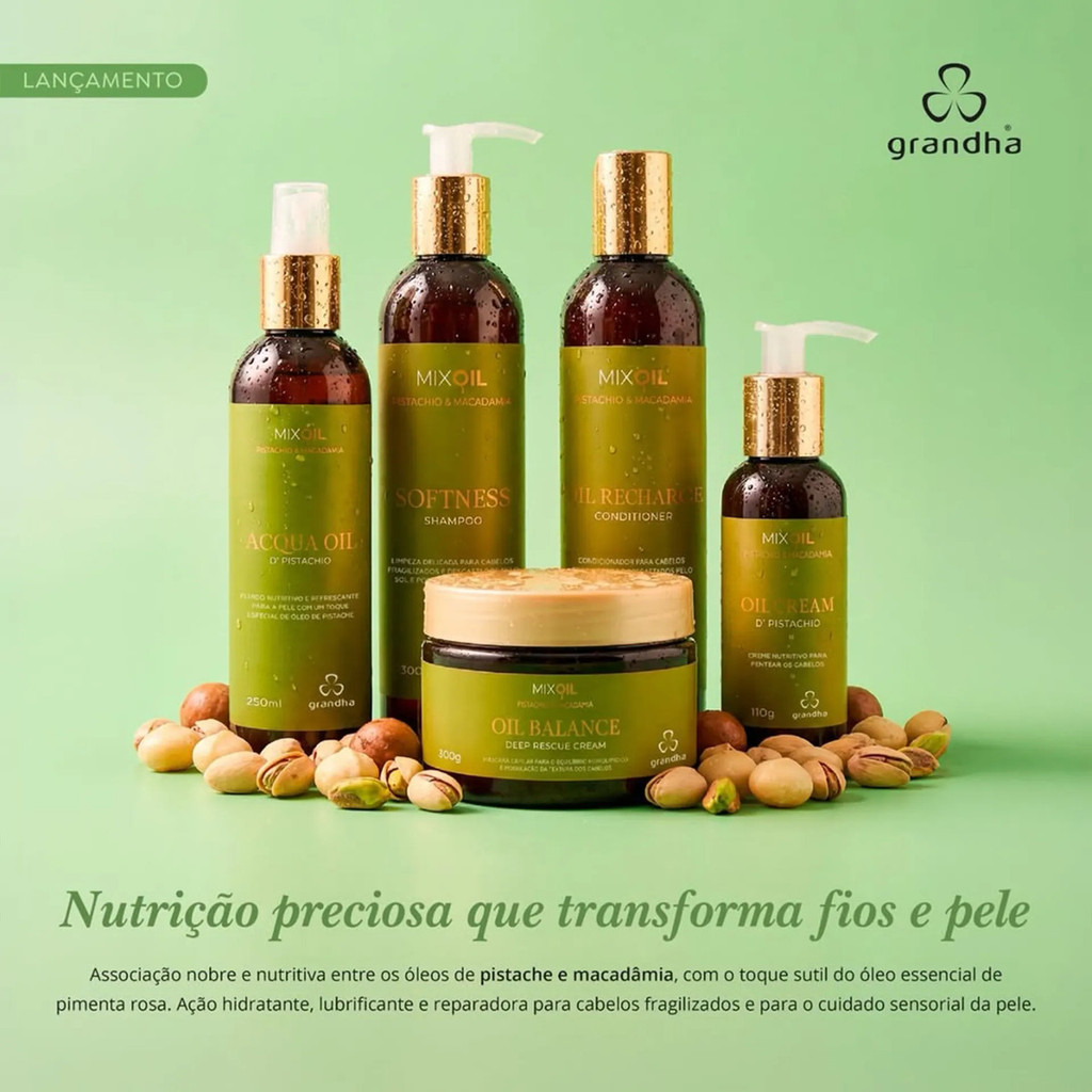 Grandha Mix Oil Pistachio & Macadamia Oil Cream D' Pistachio 110g O Oil Cream D' Pistachio possui ação hidratante, lubrificante e reparadora de cabelos fragilizados pelo tempo e desgastados por processos químicos convencionais. Sua fórmula especialmente projetada para melhorar a textura, harmoniza o precioso óleo vegetal de pistache com o rico óleo vegetal de macadâmia e um toque especial do óleo essencial de pimenta rosa. Uma combinação leve que prioriza o equilíbrio lipídico e a maciez dos cabelos. Modo de Uso: - Aplique o Oil Cream D' Pistache nos cabelos limpos e úmidos e distribua-o ao longo de todo o comprimento das mechas. - Massageie-as suavemente até a cobertura total dos cabelos. Finalize com as mãos. - Não enxágue. Composição: Água, Álcool Cetearílico, Óleo de Palmiste, Glicerol, Dimeticona, Álcool Cetílico, Cloreto de Beentrimônio, Amino Bispropil Dimeticona, Perfume, Cloreto De Cetrimônio, Monoestearato de Glicerila, Fenil Trimeticona Aminopropílica, Dimeticonol, Álcool Etílico, Álcool Isopropílico, Edetato Dissódico, Óleo da Semente de Pistache, Tricedete-12, Óleo da Semente de Macadâmia Ternifolia, Ácido Cítrico, Dodecilbenzenosulfonato De Trietanolamina, Óleo da Semente de Aroeira, Polifenilsilsesquioxano, Crospolímero de Dimeticona, Poliaminopropil Biguanida, Limoneno, Hexil Cinamal, Álcool Estearílico, Tetrametil Acetiloctaidronaftalenos, Hexametilindanopirano, Álcool Miristílico, Salicilato de Benzila, L-Alfa-Pineno, Álcool Laurílico, Linalol, Acetato de Linalila, Extrato da Folha de Oliveira, Óleo de Casca de Limão Siciliano, Cumarina, Pentileno Glicol, Betaciclodextrina, Goma Guar, Goma Xantana, Ácido Fitico, Tocoferol. Informações Importantes: - Certificado pela Academia Brasileira de Tricologia (ABT) - Dermatologicamente testado - Não testado em animais Grandha sempre à frente!