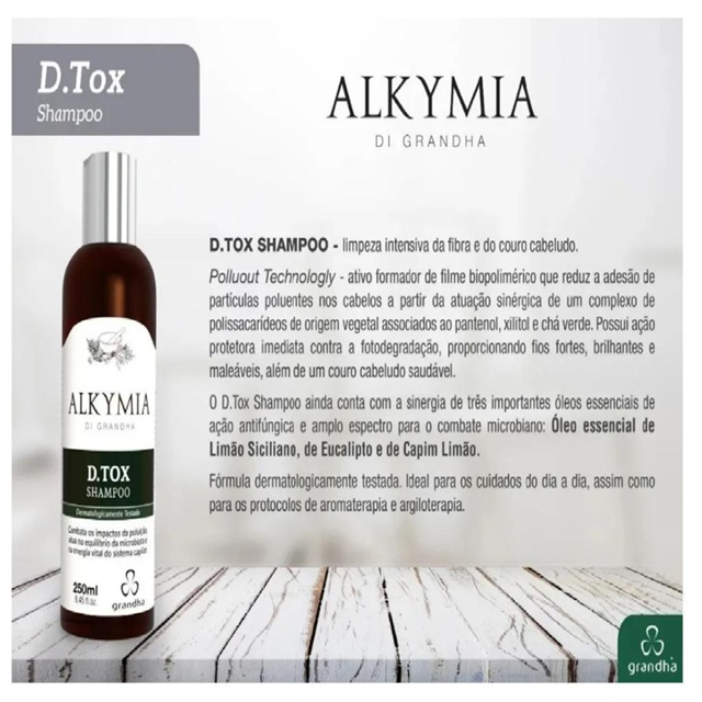 D.TOX SHAMPOO ALKYMIA DI GRANDHA 250g O D.Tox Shampoo é a solução perfeita para uma limpeza profunda dos seus cabelos e couro cabeludo. Com uma fórmula dermatologicamente testada, ele combina três importantes óleos essenciais de ação antifúngica e amplo espectro: limão siciliano, eucalipto globulus e capim-limão. Além de ser ideal para uso diário, o D.Tox Shampoo é uma escolha perfeita para protocolos de aromaterapia e argiloterapia. Benefícios: Limpeza intensiva da fibra capilar e do couro cabeludo Ação antifúngica eficaz Exclusiva Polluout Technology para proteção contra partículas poluentes Fortalece os fios Promove brilho e maleabilidade Contribui para um couro cabeludo saudável Modo de Uso: Aplique o D.Tox Shampoo nos cabelos previamente molhados e faça uma massagem abundante para aproveitar ao máximo o efeito hidratante da espuma. Enxágue completamente. Informações Importantes: Combate os impactos da poluição Equilibra a microbiota do couro cabeludo Dermatologicamente testado Certificado pela ABT - Academia Brasileira de Tricologia Sem corantes Não testado em animais Com óleos essenciais de limão siciliano, eucalipto globulus e capim-limão