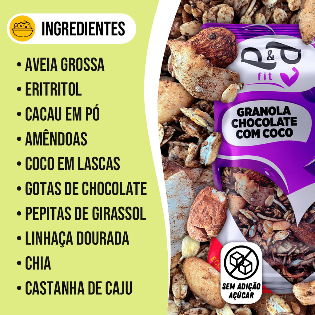 A Granola Chocolate com Coco da P&P Fit é uma explosão de sabor e saúde! Feita com ingredientes naturais e zero adição de açúcar, ela combina o crocante das sementes e oleaginosas com o sabor envolvente do chocolate e o toque tropical do coco em lascas. Ideal para um café da manhã nutritivo, lanches entre refeições ou para incrementar bowls, iogurtes e frutas. Com textura crocante e ingredientes selecionados, é perfeita para quem busca energia, sabor e qualidade no dia a dia. ℹ Benefícios: ✅ Muito crocante e saborosa ✅ Granola Premium com ingredientes selecionados ✅ Sem adição de açúcar ✅ Rica em fibras e gorduras boas ✅ Ideal para dietas equilibradas e rotina saudável ✅ Versátil: perfeita para bowls, frutas, iogurtes ou pura ℹ Ingredientes: ✅ Aveia grossa ✅ Eritritol ✅ Cacau em pó ✅ Amêndoas ✅ Coco em lascas ✅ Gotas de chocolate ✅ Pepitas de girassol ✅ Linhaça dourada ✅ Chia ✅ Castanha de caju ✅ Gergelim branco