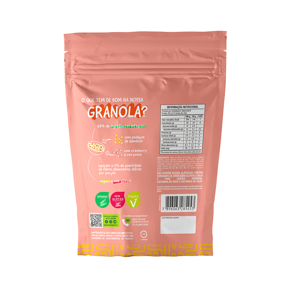 A granola sem glúten frutas tropicais da Vitao é uma opção nutritiva e saborosa para começar o dia com energia. Feita com ingredientes selecionados e livres de glúten, essa granola é perfeita para pessoas com restrições alimentares. Ela é cuidadosamente preparada com uma combinação de flocos de cereais, castanhas, sementes e frutas desidratadas, proporcionando um mix equilibrado de sabores e texturas. As frutas adicionam um toque naturalmente doce à granola, enriquecendo-a com vitaminas e fibras. É Um acompanhamento versátil, podendo ser consumida com iogurte, leite, smoothies ou como um lanche crocante por si só. Desfrute dessa granola sem glúten tradicional com frutas e aproveite um café da manhã saudável e saboroso. INGREDIENTES: Aveia em flocos sem glúten, açúcar mascavo invertido, açúcar mascavo, flocos de arroz, VITAO FLAKES sem glúten, flocos de milho não transgênico, óleos vegetais (soja, milho e algodão), cranberry em passa, coco granulado, ameixa seca em cubos, damasco em cubos, sal marinho, cúrcuma, antioxidantes lecitina de soja, INS 330, INS 320 e INS 321, corante urucum e aroma. ALÉRGICOS: CONTÉM DERIVADOS DE AVEIA (SEM GLÚTEN) E SOJA E PODE CONTER AMÊNDOA, CASTANHA-DO-PARÁ E CASTANHA-DE-CAJU. NÃO CONTÉM GÚTEN. INTEGRAL, SEM GLÚTEN, VEGANO, FONTE DE FIBRAS, BAIXO EM SÓDIO.