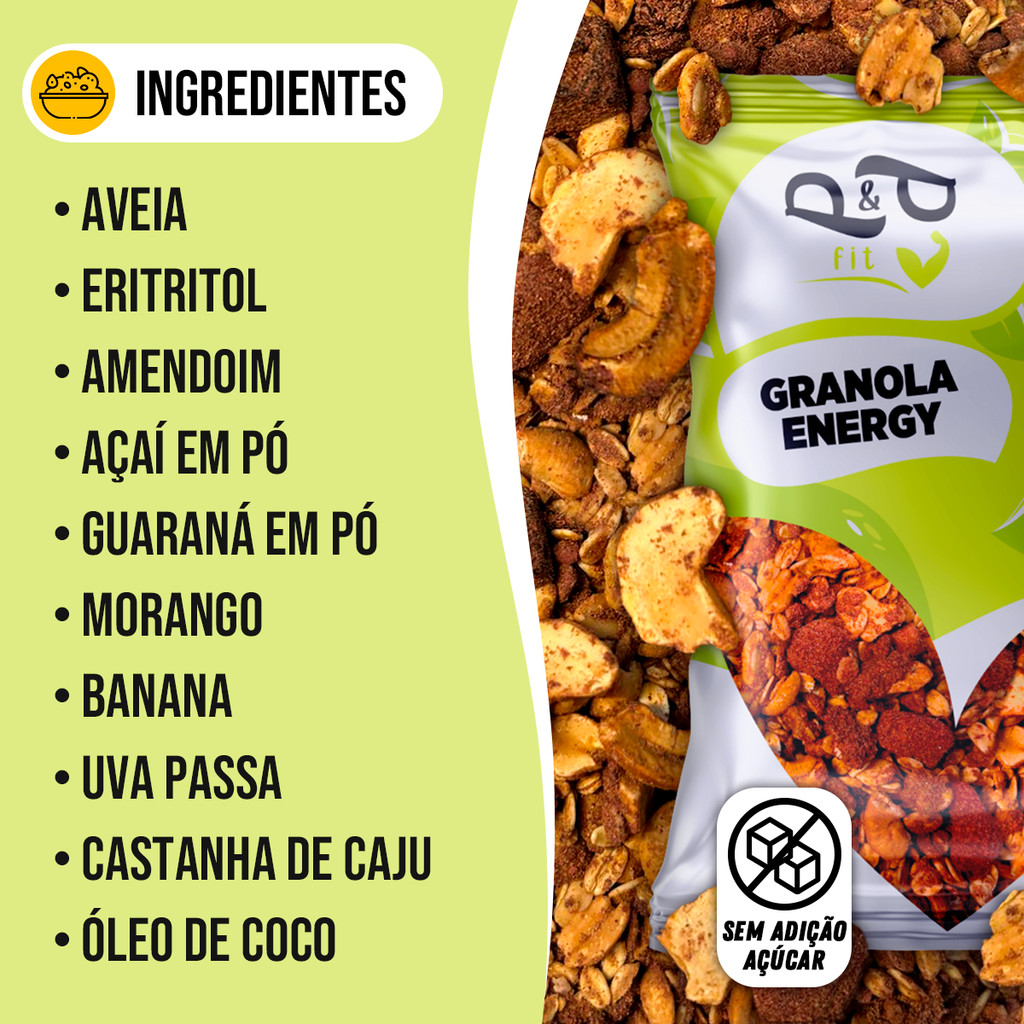 A Granola P&P Energy é uma combinação nutritiva e saborosa, desenvolvida para fornecer energia e disposição ao longo do dia. Com ingredientes selecionados como aveia, castanha de caju, morango desidratado, banana passa, uva passa, amendoim, além do toque especial do açaí e do guaraná em pó, ela oferece um sabor único e benefícios funcionais. Adoçada naturalmente com eritritol e finalizada com óleo de coco, é perfeita para quem busca um alimento saudável, sem abrir mão do sabor. Benefícios: ✅ Energia natural proveniente do guaraná e do açaí ✅ Rica em fibras, vitaminas e minerais ✅ Fonte de gorduras boas para o coração ✅ Sem adição de açúcar refinado – adoçada com eritritol ✅ Ideal para cafés da manhã, lanches e pré-treinos ✅ Combina crocância e sabor com ingredientes 100% selecionados Ficha Técnica: ✅ Produto: Granola P&P Energy ✅ Ingredientes: Aveia, eritritol, castanha de caju, açaí em pó, guaraná em pó, morango desidratado, banana passa, uva passa, amendoim, óleo de coco. Pode conter traços de outras oleaginosas. ✅ Conservação: Armazenar em local fresco, seco e protegido da luz. ✅ Validade: Vide embalagem. Imagem ilustrativa. O produto pode apresentar variações de cor, sabor e aparência, conforme as características naturais das matérias-primas e diferenças entre as safras do ano.