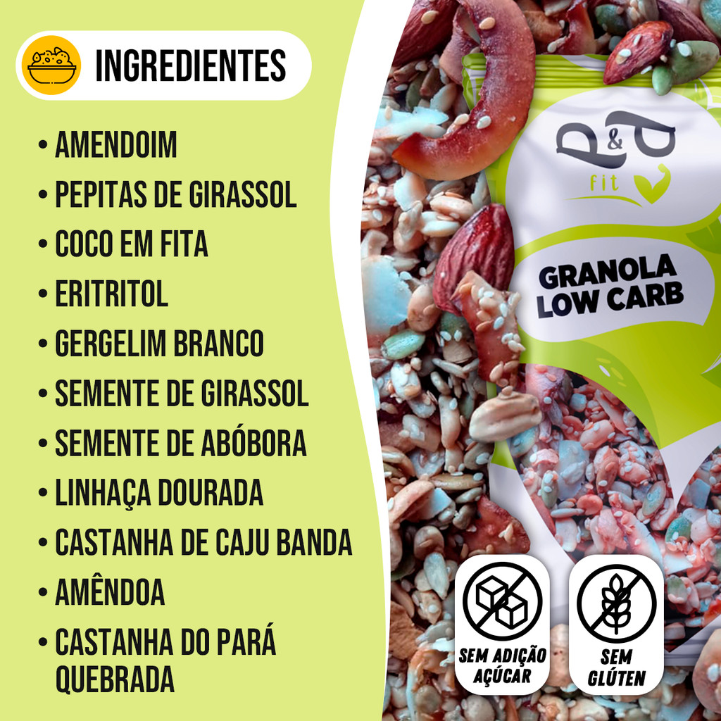 Descubra o sabor e a nutrição da Granola Low Carb P&P, uma combinação especial feita com ingredientes nobres como castanhas, sementes e coco em fita. Sem adição de açúcar, essa granola é perfeita para quem segue uma alimentação saudável, low carb ou busca reduzir o consumo de carboidratos. Sua crocância e riqueza de nutrientes transformam qualquer refeição em um momento mais nutritivo e saboroso. Ideal para consumir com iogurtes, frutas ou como snack direto do pacote! ℹ Benefícios: ✅ Sem adição de açúcar ✅ Naturalmente livre de glúten ✅ Rica em fibras e gorduras boas ✅ Baixo índice glicêmico ✅ Textura crocante e sabor marcante ✅ Ideal para dietas low carb e cetogênicas ℹ Ficha Técnica: ✅ Produto: Granola Low Carb ✅ Marca: P&P Fit ✅ Ingredientes principais: Amendoim, coco em fita, sementes de girassol, castanhas (caju, Pará), amêndoas, linhaça dourada, gergelim, eritritol e páprica ✅ Não contém glúten ✅ Adoçado naturalmente com eritritol ✅ Conservação: Armazenar em local seco, fresco e ao abrigo da luz
