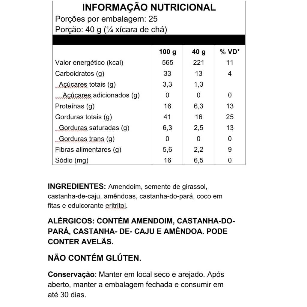 Granola Premium Low Carb Oner – 1 Kg | Zero Glúten e Zero Açúcar Descubra a combinação perfeita de sabor, saúde e crocância com a Granola Premium Low Carb Oner, desenvolvida especialmente para quem busca uma alimentação equilibrada e funcional. Ideal para dietas low carb, nossa granola é 100% natural, sem glúten, sem açúcar e feita com ingredientes selecionados para oferecer o máximo de qualidade e nutrição. Principais Benefícios: Low Carb: Com baixo teor de carboidratos, é ideal para quem deseja manter uma dieta balanceada. Zero Açúcar: Adoçada com eritritol, um adoçante natural com índice glicêmico zero. Rica em proteínas: Proporciona maior saciedade e contribui para a manutenção da massa muscular. Fonte de gorduras boas: Contém castanhas e sementes que ajudam na saúde do coração. Alto teor de fibras: Auxilia na digestão e promove o bom funcionamento intestinal. Ingredientes: Amendoim, semente de girassol, castanha-de-caju, amêndoas, castanha-do-pará, coco em fitas e eritritol. Informação Nutricional (porção de 40 g): 221 kcal Proteínas: 6,3 g Gorduras totais: 16 g Fibras alimentares: 2,2 g Carboidratos: 13 g (apenas 1,3 g de açúcares totais) Diferenciais: Sem glúten Sem adição de açúcares Sem conservantes artificiais Embalagem prática de 1 kg, ideal para consumo diário e preparo de diversas receitas saudáveis. Modo de Consumo: Perfeita para consumir pura, com iogurte, frutas ou leite vegetal. Pode ser usada como ingrediente em receitas fit, como bolos, muffins e cookies. Conservação: Manter em local seco e arejado. Após aberta, conservar a embalagem bem fechada e consumir em até 30 dias.