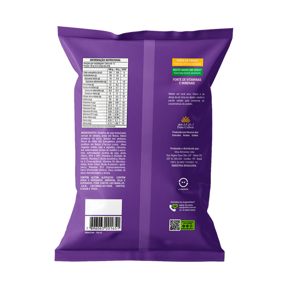 A Granola Proteica SoulPro, em parceria com Renato Cariani, traz uma deliciosa combinação de mix de cereais com aveia, tâmara e amêndoa, sabor baunilha para enriquecer sua refeição. Com um sabor irresistível, ela oferece 21 g de proteínas em 100 g, além de ser uma excelente fonte de vitaminas A, C, D, B3, B12 e ferro. Adoçada naturalmente com xarope de tâmaras, esta granola também é rica em fibras e contém baixo sódio, tornando-se uma escolha saudável e equilibrada. Perfeita para quem tem um estilo de vida ativo e busca um produto completo e nutritivo para complementar suas refeições. INGREDIENTES: Proteína de soja texturizada, xarope de tâmara, aveia em flocos, flakes proteicos de arroz, tâmara em pedaços, flocos de milho não transgênico, amêndoa, psyllium em flocos (Plantago ovata), óleos vegetais (milho, soja e algodão), cúrcuma, sal, edulcorantes xarope de maltitol e sucralose, antioxidantes lecitina de soja, ácido cítrico, BHA e BHT, Vitamina A (Acetato de retinol), Vitamina C (Ácido Ascórbico), Vitamina D (Colecalciferol), Vitamina B3 (Nicotinamida), Ácido Fólico (Ácido N-pteroil-L-glutâmico), Vitamina B12 (Cianocobalamina), Ferro (Pirofosfato férrico), Zinco (Sulfato de zinco monoidratado) e aroma. ALÉRGICOS: CONTÉM AVEIA E DERIVADOS, AMÊNDOA, SOJA E DERIVADOS. PODE CONTER CASTANHA-DE-CAJU, CASTANHA-DO-PARÁ, CENTEIO, CEVADA E TRIGO. CONTÉM GLÚTEN. PROTEICO, FONTE DE FIBRAS, ADOÇADO COM XAROPE DE TÂMARAS, FONTE DE VITAMINAS E MINERAIS.