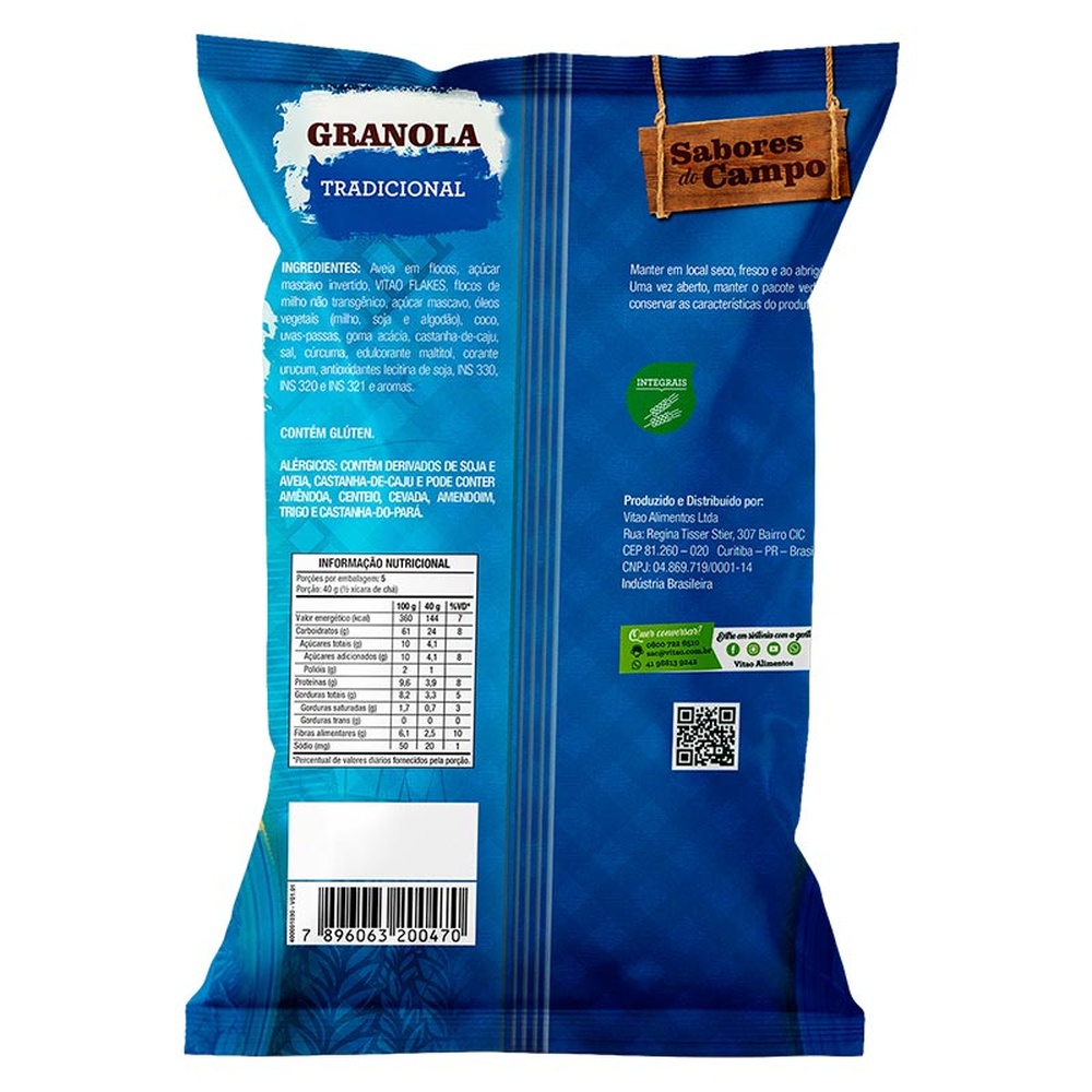 A Granola Tradicional Sabores do Campo possui 200 g e é perfeita para pessoas que valorizam uma alimentação saudável e desejam saborear um produto delicioso e nutritivo sem gastar muito. Com uma mistura cuidadosamente selecionada de grãos, castanha de caju e uvas-passas, essa granola oferece um sabor irresistível e uma textura crocante. É Uma excelente fonte de fibras e possui baixo teor de sódio, auxiliando na digestão e promovendo uma sensação de saciedade. A Granola Tradicional Sabores do Campo é o alimento perfeito para você aproveitar o sabor e a leveza que só o campo tem! INGREDIENTES: Aveia em flocos, açúcar mascavo invertido, VITAO FLAKES, flocos de milho não transgênico, açúcar mascavo, óleos vegetais (milho, soja e algodão), coco, uvas-passas, goma acácia, castanha-de-caju, sal, cúrcuma, edulcorante maltitol, corante urucum, antioxidantes lecitina de soja, INS 330, INS 320 e INS 321 e aromas. ALÉRGICOS: CONTÉM DERIVADOS DE SOJA E AVEIA, CASTANHA-DE-CAJU E PODE CONTER AMÊNDOA, CENTEIO, CEVADA, AMENDOIM, TRIGO E CASTANHA-DO-PARÁ. CONTÉM GLÚTEN. INTEGRAL, FONTE DE FIBRAS, BAIXO EM SÓDIO.