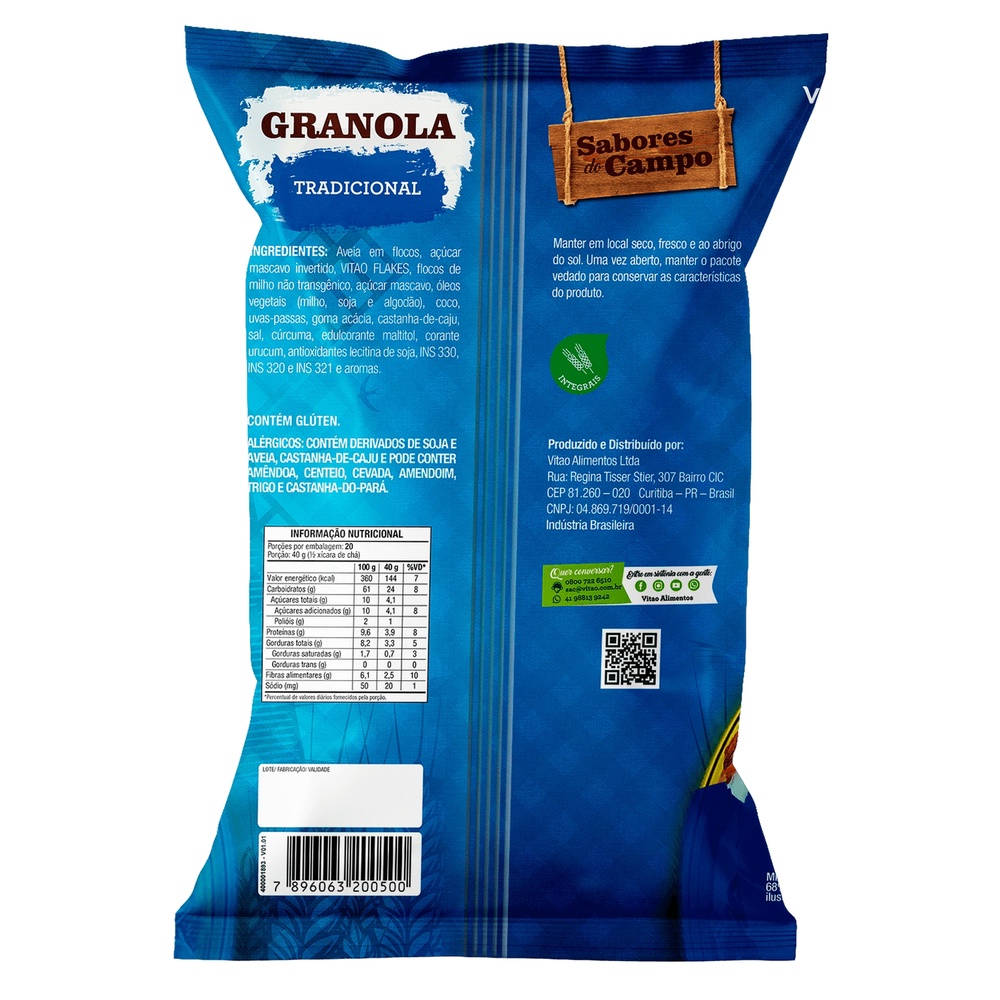 A Granola Tradicional Sabores do Campo possui 800 g e é perfeita para pessoas que valorizam uma alimentação saudável e desejam saborear um produto delicioso e nutritivo sem gastar muito. Com uma mistura cuidadosamente selecionada de grãos, castanha de caju e uvas-passas, essa granola oferece um sabor irresistível e uma textura crocante. É Uma excelente fonte de fibras e possui baixo teor de sódio, auxiliando na digestão e promovendo uma sensação de saciedade. A Granola Tradicional Sabores do Campo é o alimento perfeito para você aproveitar o sabor e a leveza que só o campo tem! INGREDIENTES: Aveia em flocos, açúcar mascavo invertido, VITAO FLAKES, flocos de milho não transgênico, açúcar mascavo, óleos vegetais (milho, soja e algodão), coco, uvas-passas, goma acácia, castanha-de-caju, sal, cúrcuma, edulcorante maltitol, corante urucum, antioxidantes lecitina de soja, INS 330, INS 320 e INS 321 e aromas. ALÉRGICOS: CONTÉM DERIVADOS DE SOJA E AVEIA, CASTANHA-DE-CAJU E PODE CONTER AMÊNDOA, CENTEIO, CEVADA, AMENDOIM, TRIGO E CASTANHA-DO-PARÁ. CONTÉM GLÚTEN. INTEGRAL, FONTE DE FIBRAS, BAIXO EM SÓDIO.