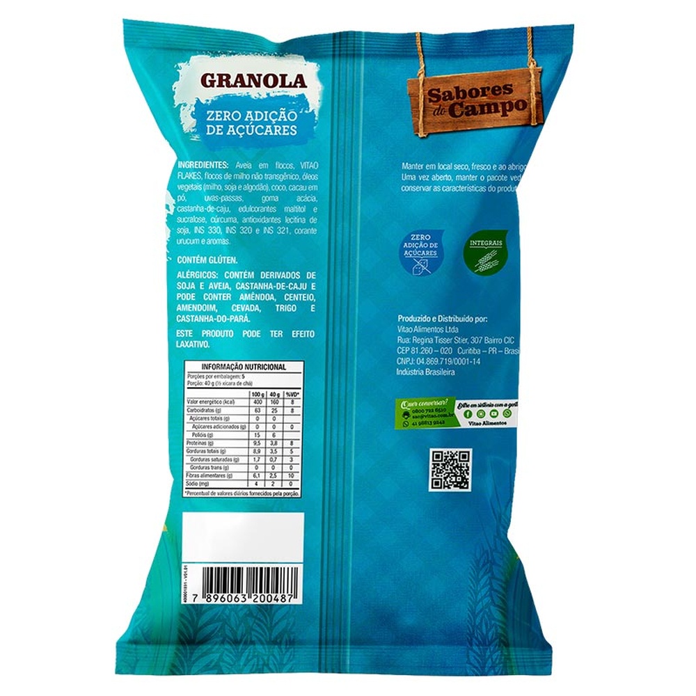 A Granola Tradicional Zero Sabores do Campo possui 200 g é perfeita para pessoas que valorizam uma alimentação saudável e desejam saborear um produto delicioso e nutritivo sem gastar muito. Com uma mistura cuidadosamente selecionada de grãos, castanha de caju e uvas-passas, essa granola oferece um sabor irresistível e textura crocante. É uma excelente fonte de fibras e possui baixo teor de sódio, auxiliando na digestão e promovendo uma sensação de saciedade. Possui zero adição de açúcares e baixo teor de sódio, o que a torna ideal para aqueles que buscam um estilo de vida mais saudável, mantendo o sabor e a leveza que só o campo tem! INGREDIENTES: Aveia em flocos, VITAO FLAKES, flocos de milho não transgênico, óleos vegetais (milho, soja e algodão), coco, cacau em pó, uvas-passas, goma acácia, castanha-de-caju, edulcorantes maltitol e sucralose, cúrcuma, antioxidantes lecitina de soja, INS 330, INS 320 e INS 321, corante urucum e aromas. ALÉRGICOS: CONTÉM DERIVADOS DE SOJA E AVEIA, CASTANHA-DE-CAJU E PODE CONTER AMÊNDOA, CENTEIO, AMENDOIM, CEVADA, TRIGO E CASTANHA-DO-PARÁ. CONTÉM GLÚTEN. INTEGRAL, ZERO ADIÇÃO DE AÇÚCARES, FONTE DE FIBRAS, BAIXO EM SÓDIO.