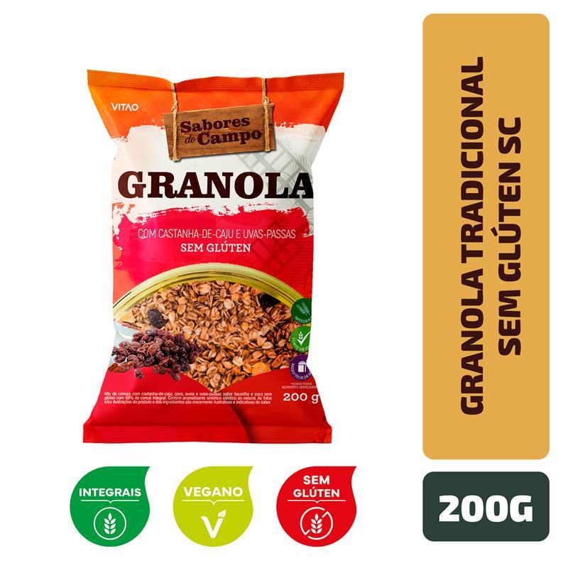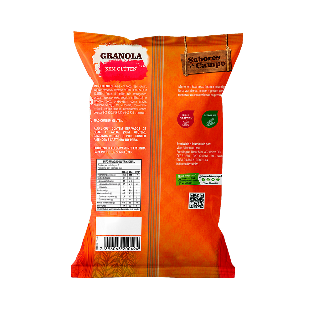 A Granola Sem Glúten Sabores do Campo possui 200 g e é perfeita para pessoas que valorizam uma alimentação saudável e desejam saborear um produto delicioso e nutritivo sem gastar muito. Com uma mistura cuidadosamente selecionada de castanha-de-caju, coco, aveia e uvas-passas, essa granola oferece um sabor irresistível e uma textura crocante. É uma excelente fonte de fibras, auxiliando na digestão e promovendo uma sensação de saciedade. Sendo 100% livre de glúten, ela é uma opção segura para celíacos e pessoas com sensibilidade ao glúten. INGREDIENTES: Aveia em flocos sem glúten, açúcar mascavo invertido, VITAO FLAKES SEM GLÚTEN, flocos de milho não transgênico, açúcar mascavo, óleos vegetais (milho, soja e algodão), coco, uvas-passas, goma acácia, castanha-de-caju, sal, cúrcuma, edulcorante maltitol, corante urucum, antioxidantes lecitina de soja, INS 330, INS 320 e INS 321 e aromas. ALÉRGICOS: CONTÉM DERIVADOS DE SOJA E AVEIA (SEM GLÚTEN), CASTANHA-DE-CAJU E PODE CONTER AMÊNDOA E CASTANHA-DO-PARÁ. NÃO CONTÉM GLÚTEN. INTEGRAL, SEM GLÚTEN, FONTE DE FIBRAS, BAIXO EM SÓDIO.