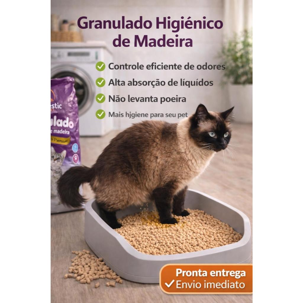 Granulado Higiênico de Madeira Biodegradável 2,5kg para Pets O Granulado Higiênico de Madeira é uma alternativa prática, natural e eficiente para a higiene do seu pet. Produzido com 100% madeira de pinus de reflorestamento, possui alta capacidade de absorção, ajudando a manter a caixa de areia ou bandeja mais seca e o ambiente mais agradável. Quando entra em contato com a umidade, os pellets se transformam em pó, facilitando a limpeza e a remoção das partes utilizadas. Além disso, auxilia no controle de odores, proporcionando mais conforto para o pet e para o ambiente. É indicado para gatos, coelhos, hamsters, porquinhos-da-índia, chinchilas, répteis e outros pequenos animais, podendo ser utilizado em caixas sanitárias, bandejas ou forração de gaiolas. Diferenciais do produto Produzido com 100% madeira de pinus de reflorestamento Produto natural e atóxico Alta absorção, ajudando a manter o local mais seco Auxilia no controle de odores Biodegradável pH neutro Não possui adição de fragrâncias ou químicos agressivos Produto seguro para o uso diário Indicação de uso Gatos Coelhos Hamsters Porquinhos-da-índia Chinchilas Répteis Outros pequenos animais Modo de uso Coloque uma camada de aproximadamente 3 a 5 cm do granulado na caixa de areia ou bandeja. Remova diariamente as partes que se transformarem em pó ou estiverem úmidas. Complete com mais granulado sempre que necessário para manter a camada ideal. Faça a troca completa conforme a necessidade de uso. Conteúdo da embalagem • 1 pacote de Granulado Higiênico de Madeira – 2,5 kg Prático, natural e eficiente para manter a higiene do seu pet no dia a dia.
