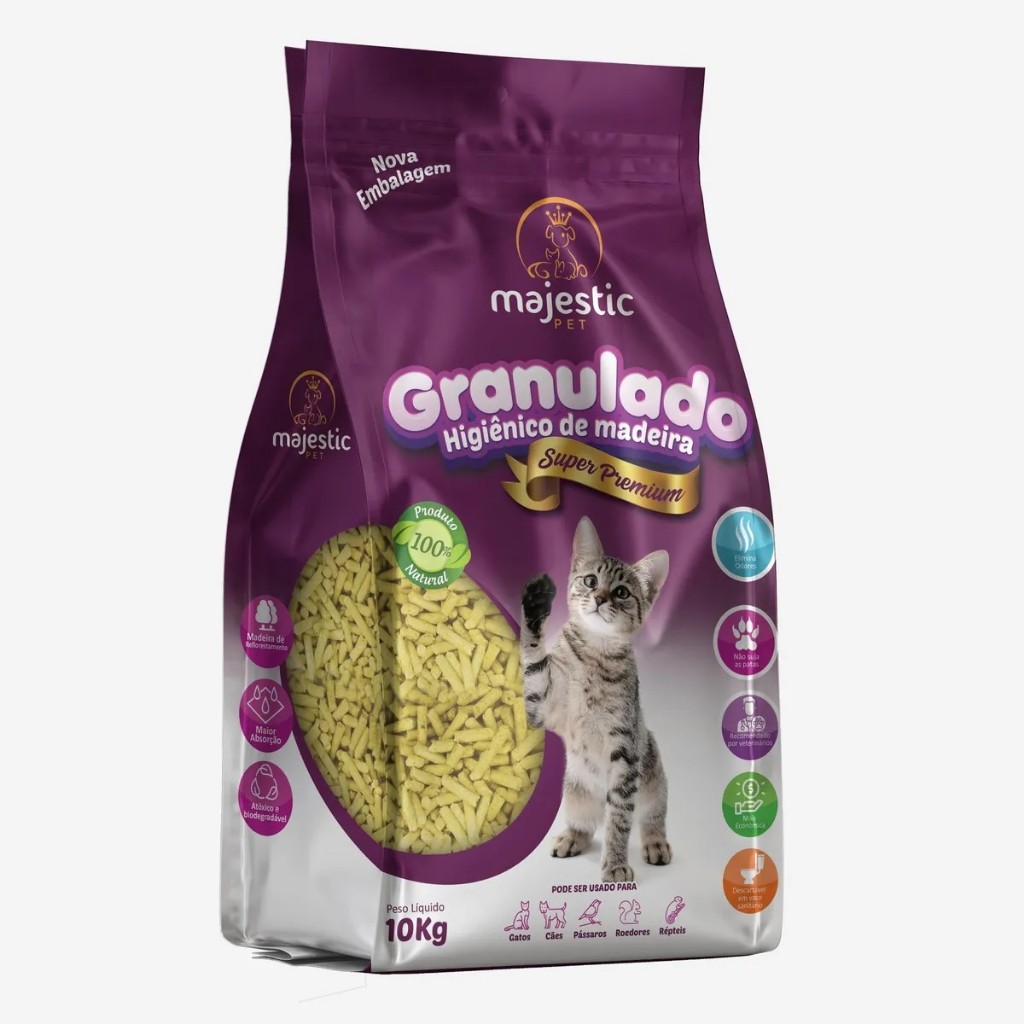 Granulado Higiênico de Madeira Majestic Super Premium 10kg - Excelente alternativa ao Carepet O Granulado Higiênico de Madeira Super Premium Majestic Pet é a melhor opção para utilizar no local onde os animais fazem suas necessidades, por ter uma absorção melhor do que a areia e uma durabilidade maior, o granulado de madeira se demonstra mais eficiente e se torna o produto mais querido entre os animais e seus tutores. Vantagens: - 100% Natural. - Produto Biodegradável. - Ecologicamente Correto. - Melhor Absorção. - Elimina o Odor. - Rende muito Mais. - Recomendado por Veterinários. Fabricado a partir de pó de Madeira Pinus, proveniente de reflorestamento, produto 100% natural, produto atóxico que não prejudica o animal. Recomendado para Gatos, Roedores, Pássaros e Répteis. Utilize em todas as situações em que seja necessário promover a absorção de urina destes animais. Possui grande absorção e elimina com muita eficácia odores de urina, superior à maioria dos produtos existentes no mercado, proporcionando uma grande economia comparado aos demais. Modo de Usar: 1 - Despeje o Granulado Higiênico De Madeira Super Premium Majestic Pet formando uma camada de 1cm a 2cm de altura. 2 - Após absorção, o Granulado Higiênico De Madeira Super Premium Majestic Pet, sofrerá uma alteração em sua consistência, primeiramente floculando e posteriormente desfazendo-se em pó em excesso diariamente. 3 - O Granulado Higiênico De Madeira Super Premium Majestic Pet deve ser totalmente substituído a cada 7 dias ou quando necessário. 4 - Descarte no vaso sanitário o Granulado Higiênico De Madeira Super Premium Majestic Pet.