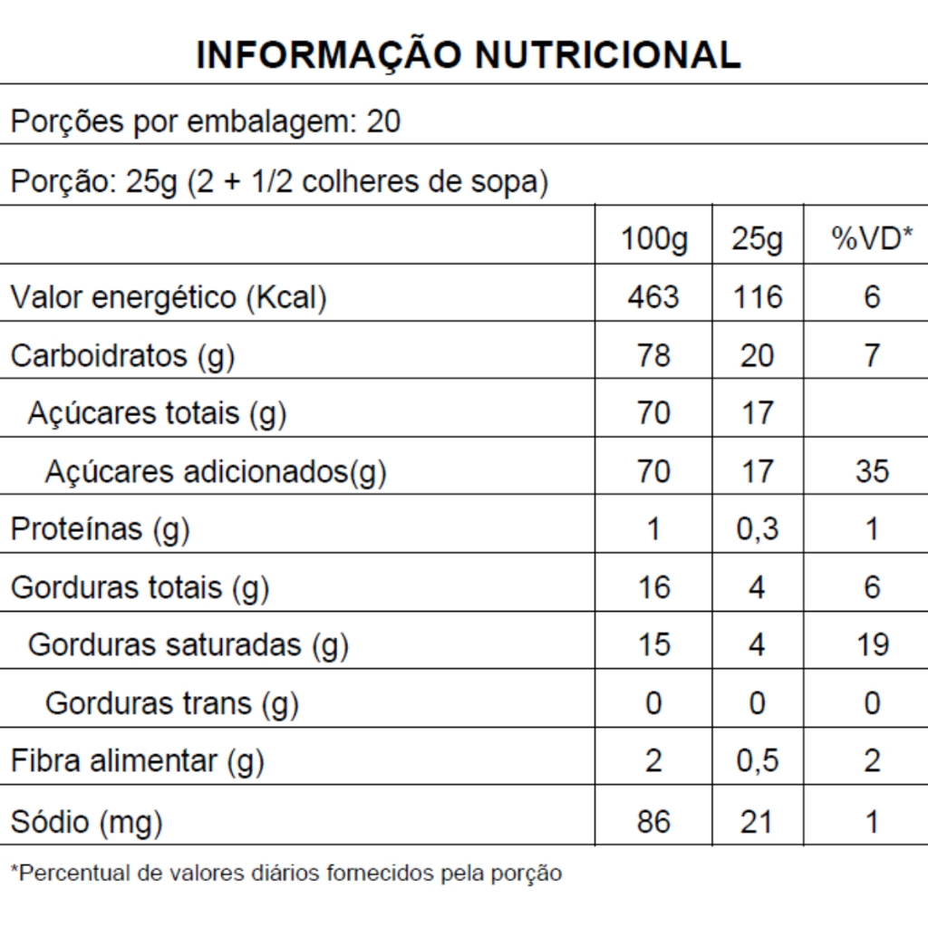 Decoração de brigadeiros, docinhos, bolos, tortas, pães, mousses, verrines, pães de mel, cupcakes, churros, pizzas; Ideal para sobremesas geladas pois não derrete em contato com a umidade. NÃO CONTÉM GLÚTEN. ALÉRGICOS: CONTÉM DERIVADOS DE SOJA. PODE CONTER LEITE. INGREDIENTES: Açúcar, gordura vegetal, glicose em pó, cacau em pó, amido de milho (Bacillus thuringiensis, Streptomyces viridochromogenes, Agrobacterium tumefaciens, Zea mays, Sphingobium herbicidovorans, Dicossoma sp., Diabrótica virgífera, Thermoccocales spp., Bacillus subtillis) sal, emulsificantes lecitina de soja (INS 322) (Agrobacterium tumefaciens e ou Bacillus thuringiensis), e mono e diglicerídeo de ácidos graxos (INS 471), umectante glicerol (INS 422), glaceante talco (INS 553iii), espessante goma arábica (INS 414) e extrato de cacau. Armazenar fechado em local fresco, seco, limpo e inodoro. Evitar exposição ao sol. Após aberta a embalagem, recomenda-se o consumo do produto em até 30 dias e que seja guardada bem fechada em local fresco, seco, limpo e inodoro. Não armazenar em geladeira ou em câmara frigorífica. Somos uma loja especializada em artigos de festa, confeitaria, embalagens e atacado em doces com lojas físicas no estado de São Paulo, desde 2002. Imagens meramente ilustrativas, de acordo com nossos fornecedores que nos fornecem. Todas as Informações divulgadas são de responsabilidade do fabricante/fornecedor.