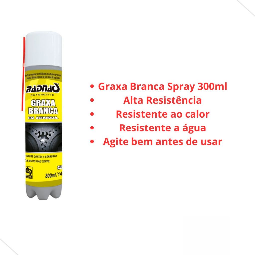 Graxa Branca Spray 300ml Alta Resistência Radnaq A Graxa Branca Radnaq é um lubrificante de alta qualidade utilizada para lubrificar peças metálicas. É um lubrificante de ação prolongada que contém uma combinação de sólidos lubrificantes brancos, e que se destacam pela excepcional aderência; alta resistência a cargas elevadas e excelente resistência ao envelhecimento. Resistente ao calor e a água. Após a aplicação e secagem forma uma camada cerosa de longa duração que protege, elimina ruídos, desgaste e permanece flexível. O produto pode ser aplicado com a finalidade de lubrificação de peças metálicas móveis ou não, na proteção contra a corrosão no interior dos para-lamas, portas, travas de capô, máquinas de vidros, especial para automóveis, caminhões, ônibus, lanchas, motocicletas, etc. Modo de Usar: AGITE BEM ANTES DE USAR. Aplique a Graxa Branca Radnaq diretamente na superfície a ser protegida ou lubrificada, a uma distância de pelo menos 30 cm para formar uma espessa película protetora do produto. Itens inclusos: - 300ml Graxa branca Spray - Nfe
