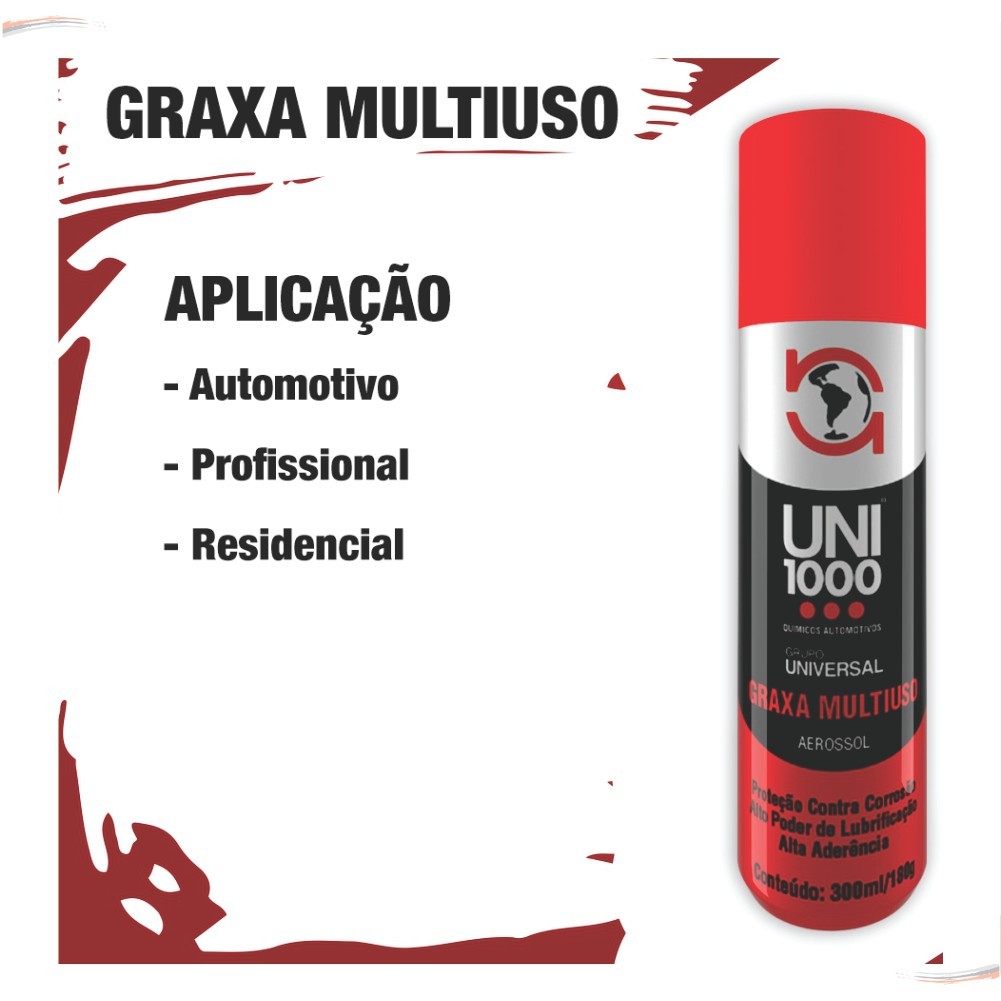 Graxa Multiuso UNI1000------------------------------------------------------------------------------------------------------------------------------A Graxa Multiuso UNI1000® oferece alta performance e excelente lubrificação com alta resistência a água, além de auxiliar na prevenção de formação de oxidação, protegendo contra a corrosão. Possui ótima aderência ao metal, indicado para áreas e peças que estão sujeitas a elevadas temperaturas, altas pressões e vibrações; por exemplo: cubos de roda, juntas estriadas, eixo de cardans, fechaduras, pinos de capô, mancais simples, rolamentos, acoplamentos flexíveis, partes móveis de máquinas e pequenas caixas de engrenagem.------------------------------------------------------------------------------------------------------------------------------PRINCIPAIS VANTAGENS:- Alta performance;- Proteção contra a corrosão;- Reduz atrito;- Resistente a água;- Elimina ruído;- Alto poder de penetração;- Aderência ao metal;- Lubrifica;- Resistente a alta temperatura.