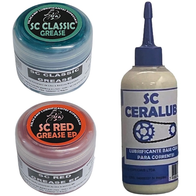 CONTEDO DO KIT: 1 UNIDADE - GRAXA SC RED GREASE EP 60G 1 UNIDADE - GRAXA SC CLASSIC 60G 1 UNIDADE - CERALUB - LUBRIFICANTE DE CORRENTE 100 ML GRAXA RED GREASE EP - (TIMA PARA CAIXA DE DIREO ( CAIXA CENTRAL ) - Graxa de colorao vermelha com aditivo de extrema presso, apresenta excelentes propriedades anti desgaste, estabilidade ao trabalho, bombeabilidade, tima resistncia oxidao, resistente lavagem por gua, altas cargas e choques, grande durabilidade e excelente lubricidade. GRAXA CS CLASSIC - (TIMA CUBO DE RODA ROLAMENTO E ENGRENAGEM ALTA TEMPERATURA ) uma graxa de complexo de ltio com extrema presso, formulada com leos minerais e aditivos de ultima gerao proporcionando resistncia a temperatura de at 290 graus e rotao de at 7000 rpm em rolamentos e tima resistncia a cargas de choque. Recomendada para aplicao em cubos de rodas automotivos, Bicicletas mancais de rolamento, engrenagens e outras articulaes. CERALUB um lubrificante de corrente, feito para resistir s condies mais exigentes tanto em climas midos quanto secos, mantendo a corrente limpa e diminuindo o rudo da relao,frico e atrito. Possui tima estabilidade e ao de repelncia hidrofbica .