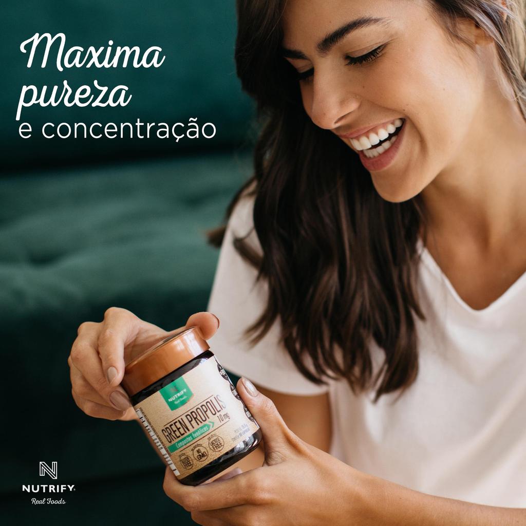 Green Propolis Nutrify oferece uma cápsula softgel com 99mg de própolis verde em extrato seco a 70% de concentração, contendo 9,9mg de compostos fenólicos, 3,96mg de flavonoides e 4,5mg de Artepillin-C. Extraída de forma precisa e padronizada, a própolis verde utilizada é originária da planta Baccharis dracunculifolia, típica da flora brasileira, especialmente da região sudeste. Esta fórmula altamente concentrada oferece a melhor qualidade da matéria-prima, garantindo um produto sem agrotóxicos ou transgênicos. Cada cápsula de Green Propolis Nutrify equivale a 13 gotas de um extrato líquido de própolis a 11%, proporcionando uma opção prática e eficaz para quem busca um suplemento de qualidade. Para consumo diário, recomenda-se uma cápsula por dia, no horário de sua preferência.