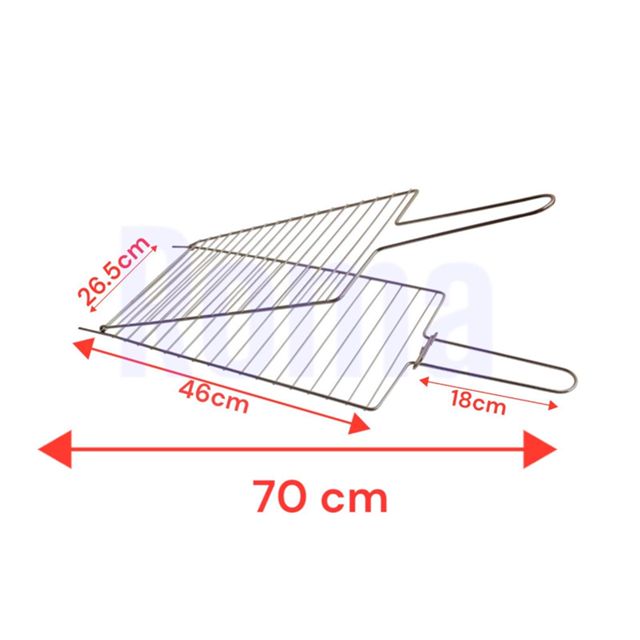 Grelha dupla, indispensável para seu churrasco sair perfeito. Excelente para assar peixes, frangos, linguiças, carnes além de outros... Permite vira o assado com facilidade na churrasqueira garantindo uniformidade, além de evitar acidentes. Material Acabamentos Aço niquelado PESO:0,50 kg MEDIDAS (C X L X A):64cm x 21cm x 10 mm PESO:0,27 kg MEDIDAS (C X L X A):54cm x 17cm x 10 mm PESO:0,58 kg MEDIDAS (C X L X A):70cm x 26,5cm x 10 mm ACABAMENTO:Niquelado
