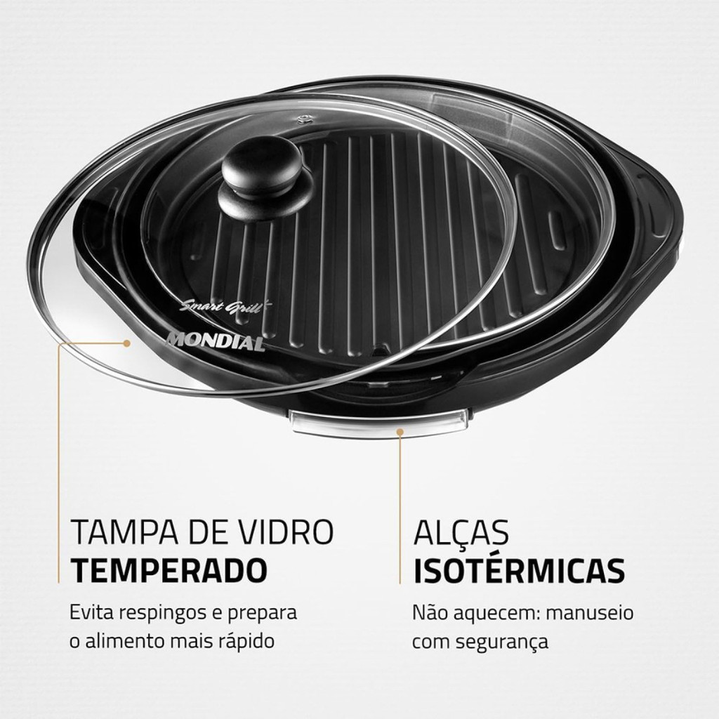 SOBRE A EMPRESA: Somos a Lojas Campana, uma empresa especializada em vendas online, revendedora autorizada das maiores marcas do mercado. Trabalhamos apenas com produtos originais com garantia de fábrica. Comprando conosco você tem a segurança que receberá seu produto na seguinte condição: => REVENDEDOR AUTORIZADO => PRODUTO ORIGINAL => GARANTIA DO FABRICANTE => PRODUTO NOVO => EMBALAGEM ORIGINAL DO PRODUTO => MANUAL DE INSTRUÇÕES => CERTIFICADO DE GARANTIA => NOTA FISCAL => PRODUTO A PRONTA-ENTREGA SOBRE O PRODUTO: O Grill Redondo Mondial Smart Grill G-04 foi desenvolvido para trazer praticidade e eficiência ao preparo das suas refeições. Com formato redondo e superfície de 30 cm de diâmetro, ele é ideal para grelhar carnes, legumes, peixes, hambúrgueres e outros alimentos de forma rápida e uniforme, atendendo perfeitamente às necessidades do dia a dia. Superfície antiaderente e fácil de limpar Conta com superfície antiaderente que evita que os alimentos grudem, facilitando a limpeza após o uso. Esse revestimento permite cozinhar com menos óleo, contribuindo para refeições mais leves e saudáveis. Aquecimento uniforme e controle simples O Smart Grill distribui o calor de maneira equilibrada por toda a área de aquecimento, garantindo um preparo homogêneo dos alimentos. Seu controle de temperatura ajustável possibilita escolher o nível ideal de calor para diferentes tipos de receitas. Praticidade no uso diário Possui bandeja coletora de gordura removível, que auxilia na redução do excesso de óleo durante o preparo e mantém o grill mais limpo. As alças com isolamento térmico proporcionam mais segurança no manuseio. Desempenho eficiente Com potência de 1200 W e funcionamento em 127 V, o Grill Mondial G-04 aquece rapidamente e oferece desempenho adequado para o preparo de diversas refeições com praticidade. Especificações técnicas Marca: Mondial Modelo: G-04 Voltagem: 127 V Potência: 1200 W Formato: Redondo Diâmetro: 30 cm Revestimento: Antiaderente Controle de temperatura: Ajustável Coletor de gordura: Sim Alças: Isoladas termicamente