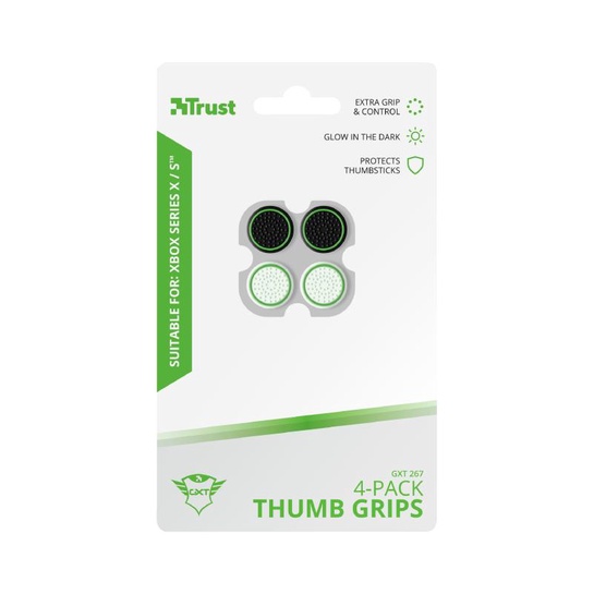 Grip Silicone Xbox GXT 267 Botão Analógico - 4 peças 2 cores - 24174 Trust - Tenha maior controle sobre os jogos com as capas aderentes para os botões analógicos do teu comando - Conjunto de 4 capas aderentes para botões analógicos no total, dois dos quais brilham no escuro - Cada capa aderente contém textura com pontos para maior aderência e controle - Impede o desgaste por utilização do comando - De fácil aplicação, remoção e limpeza Maior controle Você tem um novo Xbox Series X ou Xbox Series S? Bem-vindo aos jogos de última geração! Para ajudá-lo a obter um bom controle do seu novo controlador, esses thumbs de polegar da Trust estão lá para salvar o dia. Este conjunto possui um total de 4 alças de polegar, duas das quais brilham no escuro, para ajudá-lo a manter seus polegares nos manípulos analógicos. Menos desgaste Além da empunhadura aprimorada, essas alças de polegar reduzirão o desgaste que seu controlador enfrenta durante o uso diário. E se ficarem sujos, essas alças de polegar são facilmente removíveis e limpáveis. Então, comece o jogo e mantenha-o limpo. SKU: T24174