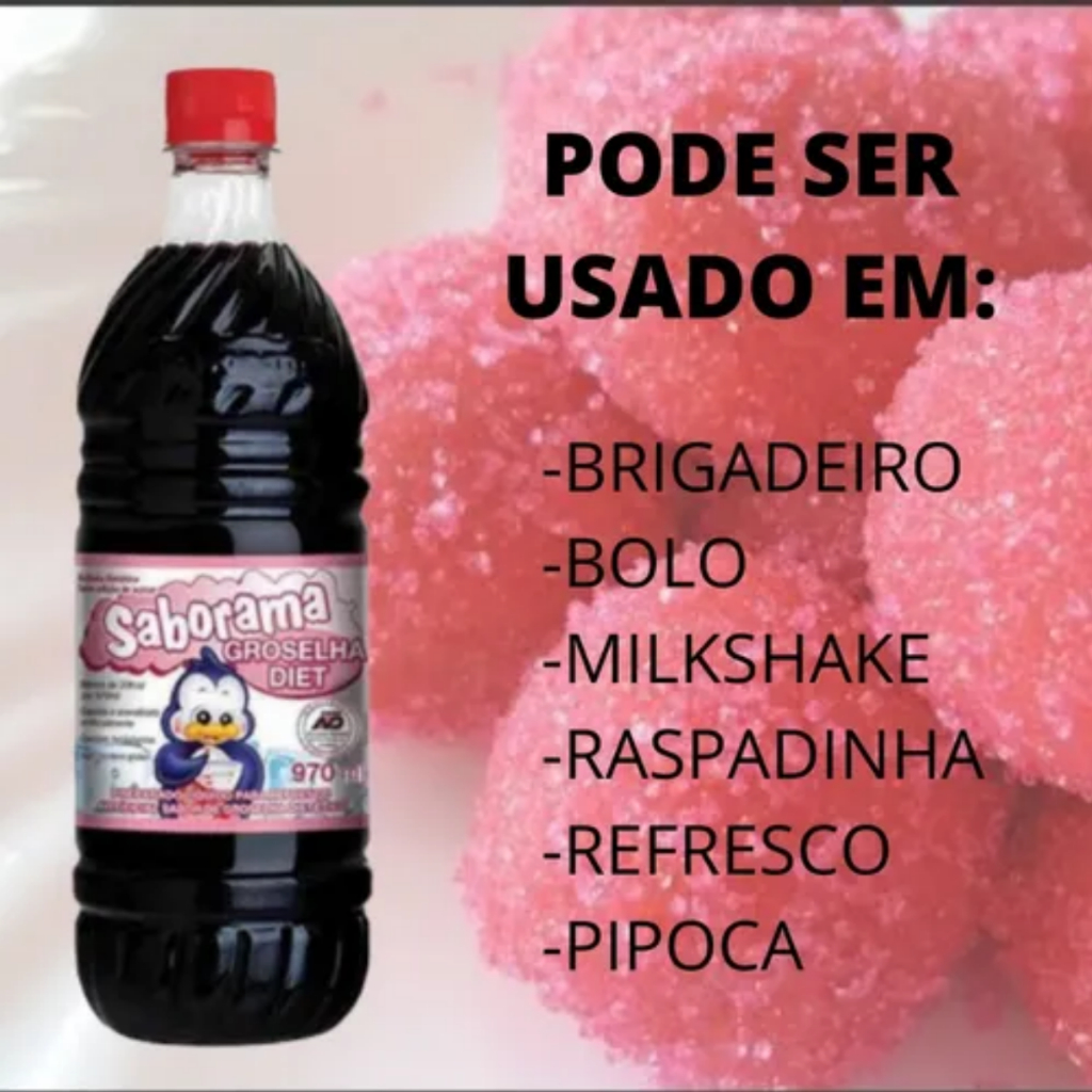 =================================================== Com mais de 10 anos de tradição atendendo os clientes, sempre com a melhor atenção, gratidão, profissionalismo e respeito. Horário de atendimento: Segunda á Sexta 08:00H - 17:00H Sábado á 08:00 - 13:00 Ficou com alguma duvida? Faça-nos uma pergunta, estaremos sempre a disposição! Boas compras!! ====================================================== GROSELHA DIET SEM ADIÇÃO DE AÇÚCAR 970ML - SABORAMA Groselha Diet Bebida dietética sem adição de açúcar, ideal para o preparo de bebidas, refrescos, geladinhos e outros. Informação Nutricional Porção de 20ml(2 colheres de sopa): Valor energético: 0Kcal; carboidratos: 0g dos quais; açúcares: 0g; proteínas: 0g; gorduras totais: 0g; gorduras saturadas: 0g ; gorduras trans: 0g ; fibra alimentar: 0g ; sódio: 20mg. Ingredientes: Água, ácido citrico e ácido fumárico, benzoato de sódio, aroma artificial de groselha, goma de guar e citrato de sódio, ciclamato de sódio, aspartame e acesulfame de potássio, bordeaux S, tartrazina e azul brilhante FCF. Não alcoólico.