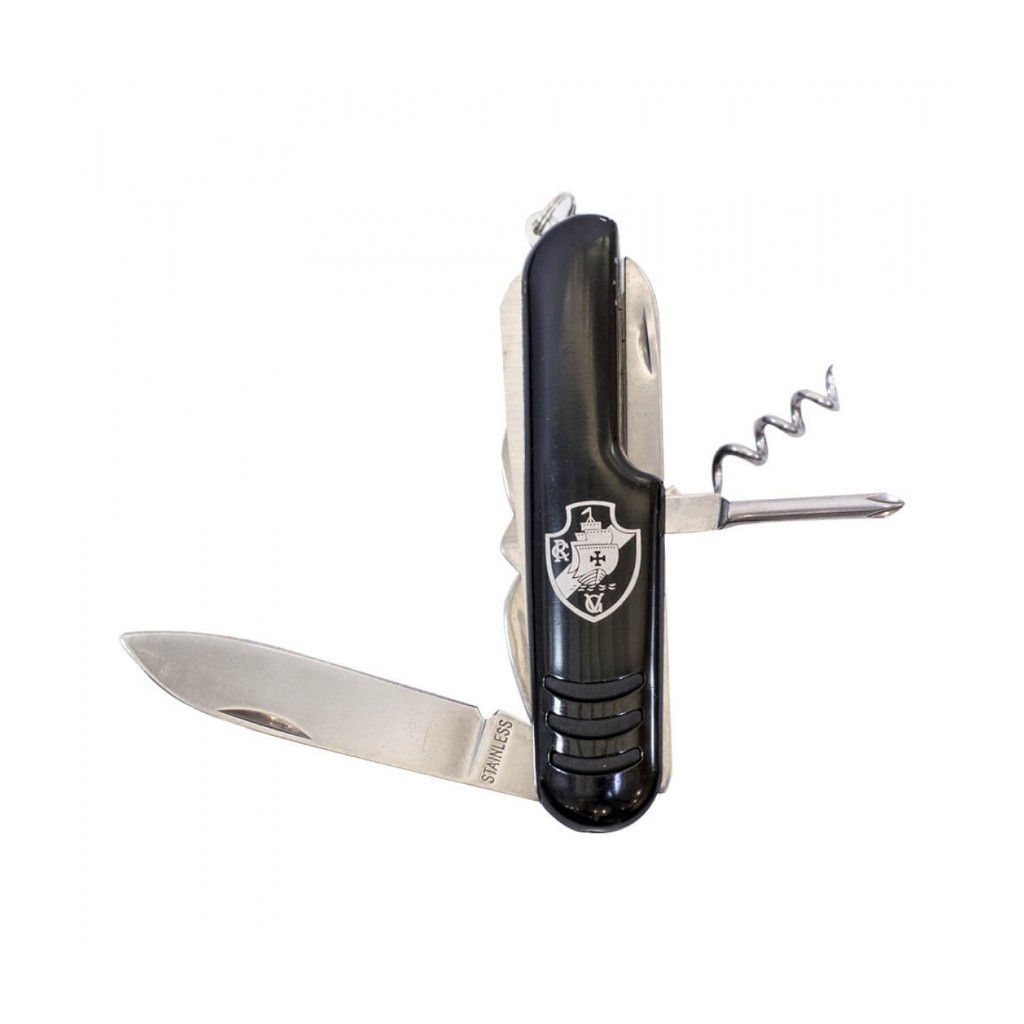 Estiloso jogo de canivete e chaveiro de metal com brasão do Vasco, já embalados prontos para presente numa lata de metal customizada com seu time de coração. Canivete possui 10 funcionalidades: lâmina de corte grande, lâmina de corte pequena, abridor de garrafas, abridor de latas, chave de fenda, chave de phillips, tesoura, abridor de vinho, lâmina de serra, lixa. Material: metal