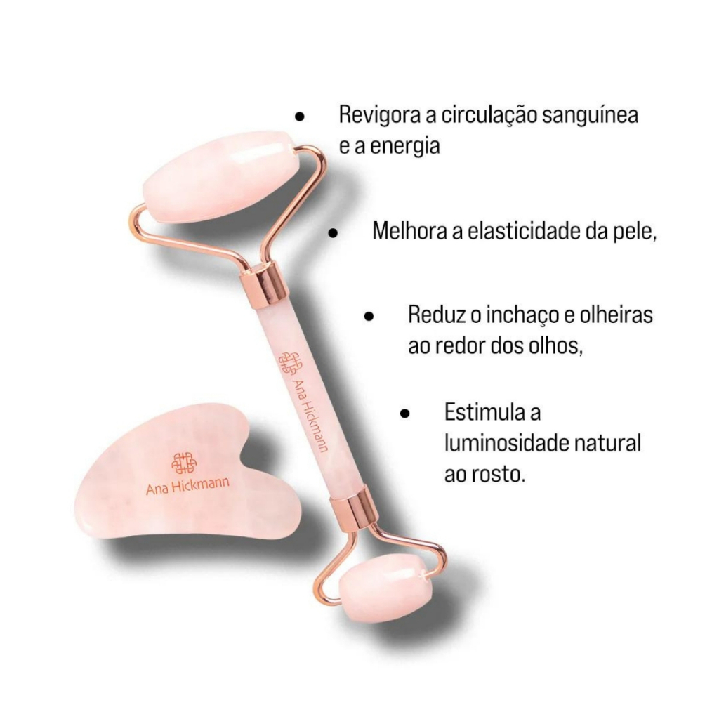 Sinta-se poderosa e confiante com a linha de maquiagens de Ana Hickmann. Produtos para rosto, olhos, boca e acessórios como esponjas, curvex, pincéis profissionais e kits. Produtos de alta performance. Seja a protagonista do seu próprio beauty show! Kit composto por um roller de massagem e um Gua Sha, ambos feitos de quartzo rosa natural. Estimula a circulação sanguínea do rosto, proporciona efeito lifting e associado à cosméticos, auxiliam na absorção dos produtos. Revigora a circulação sanguínea e a energia; Melhora a elasticidade da pele; Reduz o inchaço e olheiras ao redor dos olhos; Estimula a luminosidade natural ao rosto. Modo de uso: - Gua Sha: faça movimentos do centro do rosto, de dentro para fora, graduando a pressão conforme a sensibilidade da área escolhida. Inicie pela testa em movimentos ascendentes, das sobrancelhas em direção à raiz do cabelo; depois massageie as bochechas, com movimento da lateral do nariz até a orelha. Com o lado curvo do acessório, faça movimentos do queixo em direção à orelha. - Roller: Passe sobre o rosto com movimento suaves e leve pressão. Utilize a pedra maior para as áreas mais amplas, como bochechas e testa e a pedra menor para áreas menores e mais delicadas, como a região dos olhos. Antes de iniciar, recomendamos lavar o rosto e aplicar um hidratante, sérum ou óleo para facilitar a massagem. Material: QUARTZO ROSA * Produto Vegano *