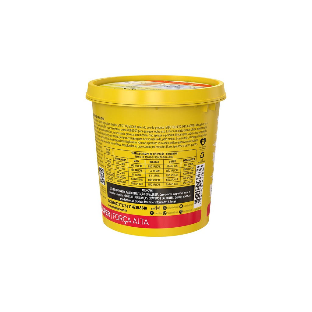 Salon Line Guanidina Óleo de Semente de Manga alisa, relaxa e reduz o volume dos cabelos, deixando-os mais lisos e soltos. Sua fórmula proporciona um resultado rápido e eficiente, além de conter Óleo de Semente de Manga, que hidrata, recupera e fortifica o fio. A Guanidina é compatível com Hidróxido de Sódio e Lithium, e incompatível com Tioglicolato de Amônia. Cuidado com colorações que contenham Amônia.
