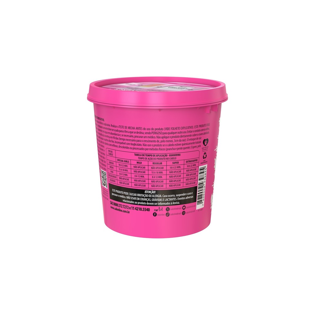 A Guanidina Special Girls alisa, relaxa e reduz o volume dos cabelos, deixando-os mais lisos, soltos, condicionados e revitalizados. Compatível com hidróxido de sódio e lithium. Uso profissional. INDICAÇÕES Para quais tipos de cabelo? Cabelos finos ou médios. Qual a indicação? Cabelos volumosos e sem movimento. Pode usar a partir de quantos anos? A partir de 12 anos. ATIVOS Quais os principais ativos? Fórmula enriquecida com Lanolina, que promove emoliência, hidratação e umectação aos fios. MODO DE USO Qual a melhor forma de usar? As instruções de uso completas estão contidas no folheto explicativo que acompanha a Guanidina Salon Line. A UTILIZAÇÃO INCORRETA PODE DANIFICAR O CABELO. Teste de mecha: é importante para verificar o tempo de ação ideal para o seu tipo de cabelo, bem como se os seus fios estão nas condições ideais para o relaxamento. Antes de iniciar o processo, divida o cabelo a partir do meio da cabeça em 4 partes - duas atrás e duas na frente. Aplique Keratin Hair Food Salon Line no pescoço, orelhas, em volta do rosto, na linha do cabelo e no couro cabeludo para evitar possíveis reações. Em caso de retoque, aplique também no comprimento do cabelo. Coloque luvas. Siga as etapas de aplicação a seguir e não pule nenhuma: 1. Preparo da mistura: não utilize materiais metálicos. Utilize sempre materiais em plástico (pente e espátulas) 2. Aplicação: comece o relaxamento pela parte de trás, mecha a mecha, aplicando generosamente com o auxílio de um pincel. Cubra todo o cabelo - e o mais rápido possível - para assegurar total cobertura de toda a cabeça. Após a aplicação do relaxamento, utilize a palma da mão para suavizar as áreas de aplicação, sempre manipulando no sentido dos fios e nunca ao contrário, pois esse esforço poderá parti-los. Aplique o relaxamento por área. Em cabelos virgens, enluve gentilmente com 0,5 cm de distância da raiz às pontas. Não puxe ou estique o cabelo. Para obter distribuição homogênea, enluve e manuseie levemente os cabelos com as mãos e use os últimos minutos do tempo de relaxamento para massagear o cabelo, verificando se alguma área ficou sem aplicação. 3. Enxágue e neutralização: comece o enxágue pela parte de trás do cabelo, cuidadosamente, com água em abundância morna ou em temperatura ambiente. Aplique o Neutralizing Shampoo Salon Line. Ele é indispensável para a remoção total de resíduos. 4. Condicionamento e finalização: aplique um Condicionador Salon Line de sua preferência. Distribua uniformemente a Guanidina por todo o cabelo e deixe agir por 5 minutos, enxágue e finalize como desejar. Lembre-se: o ideal é que se faça um tratamento diário com a linha Salon Line utilizando Shampoo, Máscara e Condicionador para que o cabelo fique ainda mais fortalecido. Dicas de uso Use luvas durante todo o processo de aplicação do relaxamento/amaciamento com Guanidina e não lave os cabelos por pelo menos 3 dias antes do procedimento. Salon Line recomenda Em caso de dúvidas consulte um profissional ou ligue para o nosso SAC. CARACTERÍSTICAS É produto vegano? O produto não é vegano. É liberado? O produto não é liberado.