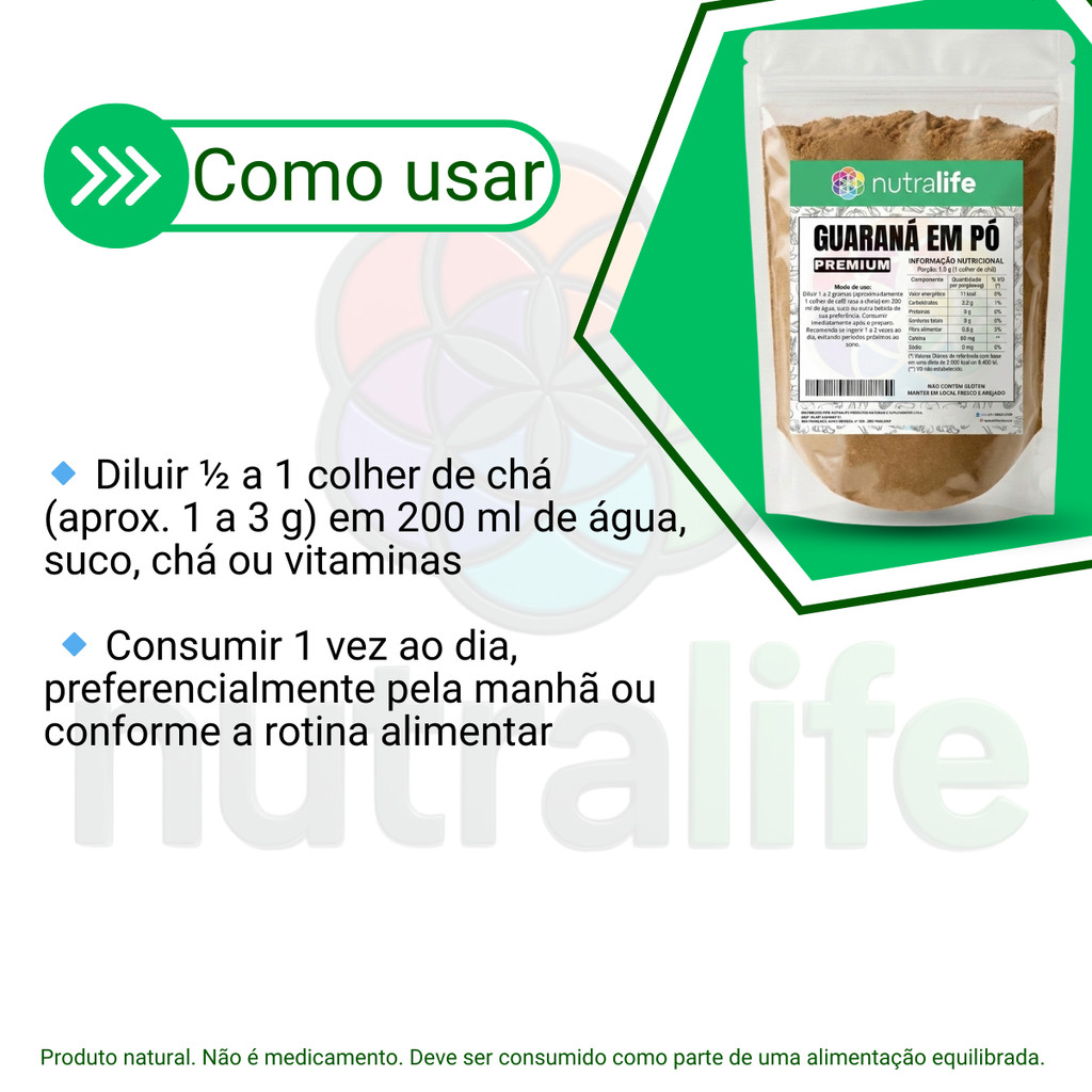 🟢 Descrição do Produto – Guaraná em Pó Premium O Guaraná em Pó Premium é um produto natural de alta qualidade, obtido a partir de sementes selecionadas e cuidadosamente processadas para preservar suas características naturais. Tradicionalmente utilizado na alimentação, é ideal para complementar a rotina alimentar com um ingrediente natural e versátil. Produzido com matéria-prima selecionada, passa por rigoroso controle de qualidade e conta com laudo, garantindo maior segurança, pureza e confiabilidade. Disponível nas opções de 250g, 500g e 1kg, oferece excelente rendimento e ótimo custo-benefício para o consumo diário. 🌿 Benefícios ✔ Auxilia na disposição e energia do dia a dia ✔ Pode contribuir para o foco e a concentração ✔ Rico em compostos naturais que apoiam a vitalidade ✔ Tradicionalmente utilizado como suporte nutricional ✔ Produto natural para complementar a rotina alimentar 🥄 Modo de Uso Diluir ½ colher de café a 1 colher de chá (aprox. 0,5 a 2 g) em 200 ml de água, suco, vitaminas ou outras bebidas. Consumir 1 vez ao dia, preferencialmente pela manhã ou conforme a rotina alimentar. 📦 Informações do Produto Produto: Guaraná em Pó | Qualidade: Premium | Uso: Alimentar Opções de peso: 250g | 500g | 1kg Diferencial: Produto com laudo de qualidade Livre de aditivos químicos* (*quando aplicável) ⚠️ Aviso Importante Produto natural. Não é medicamento. O consumo deve estar associado a uma alimentação equilibrada. guaraná em pó, guaraná natural, guaraná premium, produto natural em pó, suplemento alimentar natural