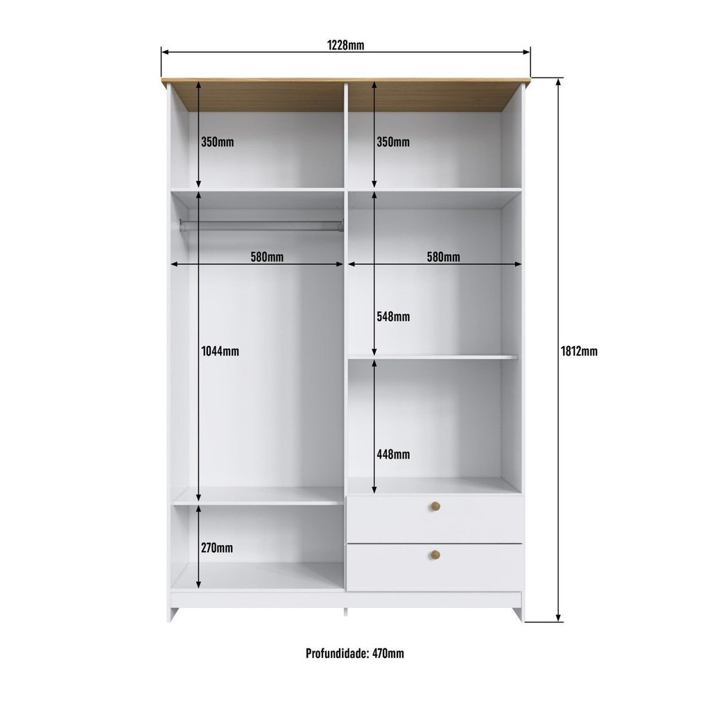 O dormitório Americano é sofisticado, aconchegante e cheio de estilo. O guarda-roupa com quatro portas e duas gavetas com corrediças metálicas, tem lindos puxadores em ponto dourados, que dão um toque a mais de beleza ao móvel. Todas as peças do produto são numeradas para facilitar no momento da montagem. Estilo: Clássico Modular: Não Peso (kg): 65.3 Garantia: 03 Meses Altura (cm): 181.2 Largura (cm): 122.8 Possui Pés: Não Possui Portas: Sim Tipo de Porta: Bater Possui Gavetas: Sim Suporta Até (kg): 24 Tipo de Gaveta: Externa Possui Espelhos: Não Profundidade (cm): 47 Escala de Brilho: Semi-Brilho Gaveta com Chave: Não Possui Calceiros: Não Material da Porta: MDP Origem do Produto: Nacional Ambiente Principal: Quarto Material da Gaveta: MDP Material Principal: MDP Possui Prateleiras: Sim Acabamento da Porta: Pintura UV Nicho com Cabideiro: Sim Acabamento da Gaveta: Pintura UV Tipo de Guarda-roupa: Solteiro Espessura do Fundo (mm): 2.8 Material da Prateleira: MDP Peso Máximo por Gaveta: 2 Espessura das Portas (mm): 18 Acabamento da Prateleira: Pintura UV Tipo de Puxador da Porta: Externo Escala de Brilho da Porta: Semi-Brilho Espessura da Estrutura (mm): 12 Tipo de Puxador da Gaveta: Externo Escala de Brilho da Gaveta: Semi-Brilho Peso Máximo por Prateleira: 3 Tipo de Corrediça da Gaveta: Metálica Simples Espessura das Prateleiras (mm): 12 Material do Puxador da Porta: ABS Possui Organizador de Gaveta: Não Escala de Brilho da Prateleira: Semi-Brilho Espessura do Fundo das Gavetas (mm): 2.8 Tipo de Dobradiça/Corrediça da Porta: Metálica Marca: Decibal Cor Interna: Branco Gelo Cor do Produto: Branco Gelo/Ipê Itens Inclusos: 1 Guarda Roupa, Kit Ferragens e Manual de Montagem Cor Predominante: Branco Linha ou Coleção: Americano Quantidade de Cabideiros: 01 Cabideiro Quantidade de Prateleiras: 04 Prateleiras Quantidade de Portas: 4 Portas Quantidade de Gavetas: 02 Gavetas