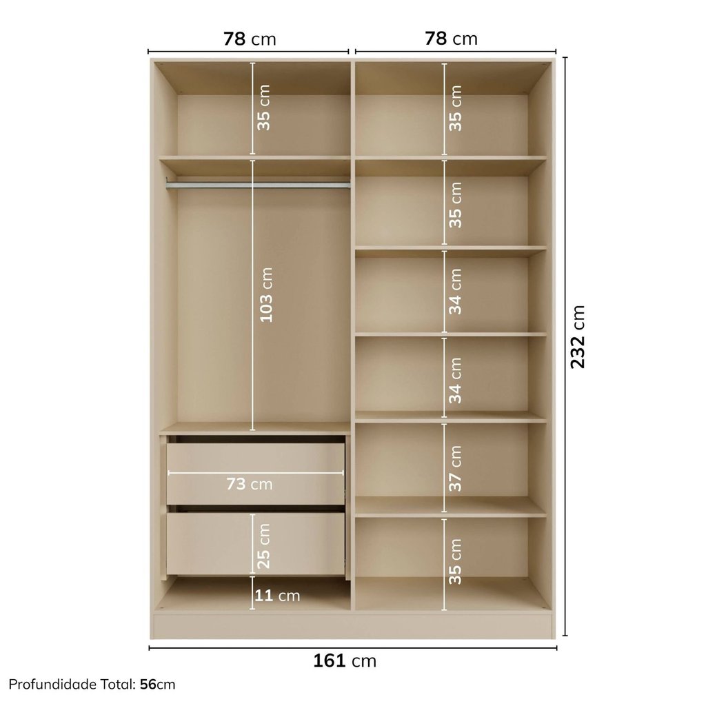 Oríon é um guarda-roupa que une tecnologia, sofisticação e design atemporal. Com portas em vidro reflecta e corpo 100% em MDF, sua composição de cores e distribuição interna valorizam a usabilidade, trazendo aconchego e elegância ao ambiente. As portas metálicas em alumínio, com puxador slim, completam o visual minimalista. Na versão com iluminação em LED dimerizável e acionamento touch lateral, o interior se transforma em uma vitrine funcional — revelando com suavidade e intensidade ajustável tudo o que importa. As prateleiras móveis e as ferragens premium — com dobradiças soft close e corrediças reforçadas de 45 mm — garantem durabilidade, conforto e sofisticação. Estilo: Moderno Modular: Sim Peso (kg): 141.85 Garantia: 24 Meses Altura (cm): 232.2 Largura (cm): 161 Possui Pés: Não Possui Portas: Sim Tipo de Porta: Bater Porta Janelada: Não Possui Gavetas: Sim Tipo de Gaveta: Interna Possui Espelhos: Não Profundidade (cm): 56 Escala de Brilho: Fosco Gaveta com Chave: Não Possui Calceiros: Não Material da Porta: Vidro Origem do Produto: Nacional Possui Cabideiros: Sim Possui Iluminação: Sim Ambiente Principal: Quarto Fabricação Própria: Sim Material da Gaveta: MDF Material Principal: MDF Possui Prateleiras: Sim Acabamento da Porta: Cristal Acabamento da Gaveta: Pintura UV Tipo de Guarda-roupa: Casal Espessura do Fundo (mm): 3 Material da Prateleira: MDF Peso Máximo por Gaveta: 3 Espessura das Portas (mm): 15 Acabamento da Prateleira: Pintura UV Tipo de Puxador da Porta: Externo Escala de Brilho da Porta: Brilhante Espessura da Estrutura (mm): 15 Tipo de Puxador da Gaveta: Não Possui Escala de Brilho da Gaveta: Fosco Peso Máximo por Prateleira: 5 Tipo de Corrediça da Gaveta: Metálica Telescópica Espessura das Prateleiras (mm): 15 Material do Puxador da Porta: Metal Possui Organizador de Gaveta: Não Escala de Brilho da Prateleira: Fosco Espessura do Fundo das Gavetas (mm): 3 Tipo de Dobradiça/Corrediça da Porta: Metálica Marca: CabeCasa MadeiraMadeira Cor Interna: Aveia Cor: Aveia/Reflecta Cor do Produto: Aveia/Reflecta Itens Inclusos: 1 Guarda-Roupa, Kit Ferragens e Manual de Montagem Cor Predominante: Off White Linha ou Coleção: Orion Quantidade de Cabideiros: 02 Cabideiros Quantidade de Prateleiras: 07 Prateleiras Quantidade de Portas: 4 Portas Quantidade de Gavetas: 02 Gavetas