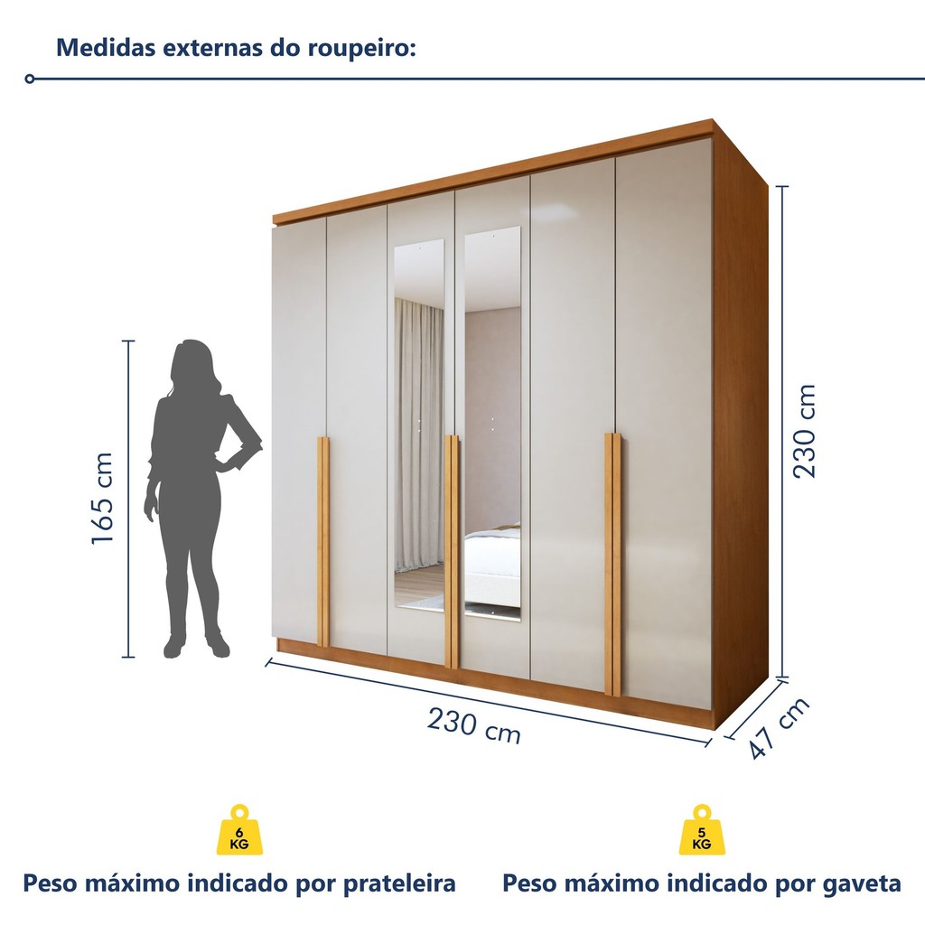 Está na hora de renovar seu quarto com um guarda-roupa que une espaço, estilo e praticidade! Nosso guarda roupa é tudo o que você procura: moderno, versátil, amplo, e cheio de compartimentos para organizar suas roupas, sapatos e acessórios. Feito com materiais de alta qualidade, ele garante durabilidade e um visual moderno que combina com qualquer decoração para quarto. É a solução ideal para quem busca funcionalidade sem abrir mão do charme. Invista no guarda-roupa perfeito e transforme seu quarto agora mesmo! Posso usar esse guarda-roupa solteiro para dividir entre duas pessoas? Sim, ele é espaçoso e prático para organizar as roupas de duas pessoas! É seguro para usar como guarda roupa infantil? Claro! Ele é feito em MDF e tem acabamento seguro, ideal para qualquer idade. Estilo: Moderno Modular: Não Peso (kg): 170.4 Garantia: 03 Meses Altura (cm): 230 Acabamento: Pintura Largura (cm): 230 Possui Pés: Não Possui Portas: Sim Tipo de Porta: Bater Possui Gavetas: Sim Tipo de Gaveta: Interna Possui Espelhos: Sim Profundidade (cm): 47 Escala de Brilho: Fosco Gaveta com Chave: Não Possui Calceiros: Não Material da Porta: MDF Origem do Produto: Nacional Possui Cabideiros: Sim Possui Iluminação: Não Ambiente Principal: Quarto Formato do Espelho: Retangular Material da Gaveta: MDF Material Principal: MDF Possui Prateleiras: Sim Acabamento da Porta: Pintura Material do Puxador: MDF Nicho com Cabideiro: Não Acabamento da Gaveta: Pintura Tipo de Guarda-roupa: Casal Espessura do Fundo (mm): 2.7 Material da Prateleira: MDF Peso Máximo por Gaveta: 5 Possui Espelho Interno: Não Quantidade de Espelhos: 04 Espelhos com Tamanhos Iguais Espessura das Portas (mm): 15 Acabamento da Prateleira: Pintura Tipo de Puxador da Porta: Embutido Escala de Brilho da Porta: Fosco Espessura da Estrutura (mm): 12 Tipo de Puxador da Gaveta: Embutido Escala de Brilho da Gaveta: Fosco Peso Máximo por Prateleira: 6 Tipo de Corrediça da Gaveta: Metálica Telescópica Espessura das Prateleiras (mm): 15 Material do Puxador da Porta: MDF Possui Organizador de Gaveta: Não Escala de Brilho da Prateleira: Fosco Espessura do Fundo das Gavetas (mm): 15 Tipo de Dobradiça/Corrediça da Porta: Metálica Marca: Móveis Lopas Cor: Amêndoa Clean/Off White Cor do Produto: Amêndoa Clean/Off White Itens Inclusos: 1 Guarda Roupa, Kit Ferragens e Manual de Montagem. Cor Predominante: Marrom Linha ou Coleção: Alonzo Cor do Puxador: Marrom Quantidade de Cabideiros: 02 Cabideiros Quantidade de Prateleiras: 06 Prateleiras Quantidade de Portas: 6 Portas Quantidade de Gavetas: 04 Gavetas Quantidade de Portas com Espelhos: 2 Portas com Espelho