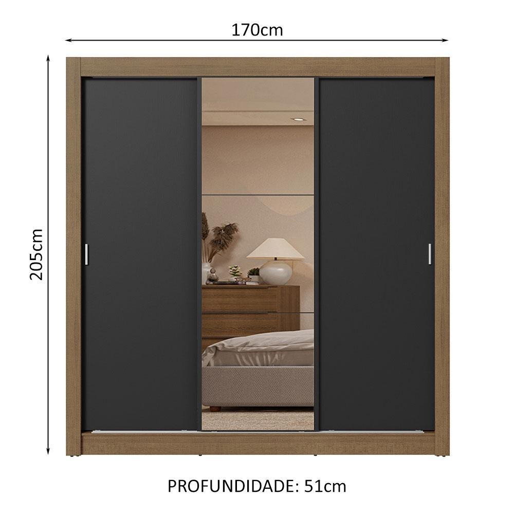 Guarda-Roupa Casal 3 Portas de Correr com Espelho 2 Gavetas Rustic/Preto Sublime Madesa