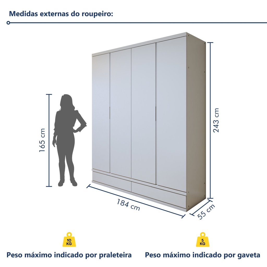 Guarda Roupa Casal 4 Portas com 5 Gavetas 100% MDF Urbano Branco