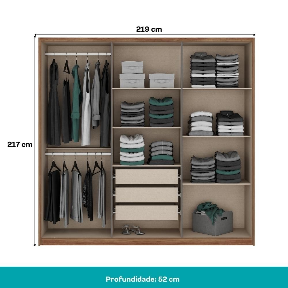 O Guarda-Roupa Belmont 1154 transforma seu quarto em um espaço que reflete sua personalidade. Suas linhas simples e modernas se harmonizam facilmente com diversos estilos de decoração, adicionando um toque de sofisticação ao ambiente. Com 6 portas de abrir divididas em 3 partes, este guarda-roupa oferece acesso fácil e organização eficiente. Além das 3 gavetas internas com corrediças metálicas, conta com 2 cabideiros em alumínio, proporcionando amplo espaço para pendurar roupas. Fabricado com MDP de alta qualidade e acabamento em pintura UV, garante durabilidade e resistência. Os puxadores em ABS complementam o design elegante deste móvel. Não deixe seu quarto sem estilo e funcionalidade, adquira já e desfrute de um ambiente confortável e organizado! Especificações do Guarda Roupa: Medidas totais: Largura: 217 cm | Altura: 219 cm | Profundidade: 46,5 cm Peso total: 128,8 Kg Garantia: Os produtos possuem garantia de 03 meses (se usado em condições normais), contra defeito de fabricação, ou componentes utilizados. Esta garantia não cobre defeitos por uso inadequado ou excessivo, falta de cuidados e desbotamento natural dos revestimentos. Condições de perda da garantia: - Mau uso ou manuseio incorreto. - Desbotamento causado pela exposição direta da luz solar. - Danos causados por agentes da natureza, como inundações ou acidentes de qualquer espécie. - Uso indevido de produtos abrasivos para realizar a limpeza. - Decurso do prazo estabelecido. Recomendações para uma boa conservação: - Dicas para limpeza e conservação do seu produto, você encontrará no esquema de montagem que o acompanha. Informações importantes: - Trabalhamos para apresentar imagens fiéis ao produto real. Porém, as cores podem sofrer variações de acordo com o monitor, iluminação do ambiente em que se encontram e até por sua percepção visual comparado ao ambiente residencial. - Desta forma, as imagens são meramente ilustrativas. - Todos os objetos decorativos não acompanham o produto. - O produto é enviado desmontado. - O produto acompanha manual com instruções para a montagem. - A empresa Móveis Carraro não realiza o serviço de montagem.