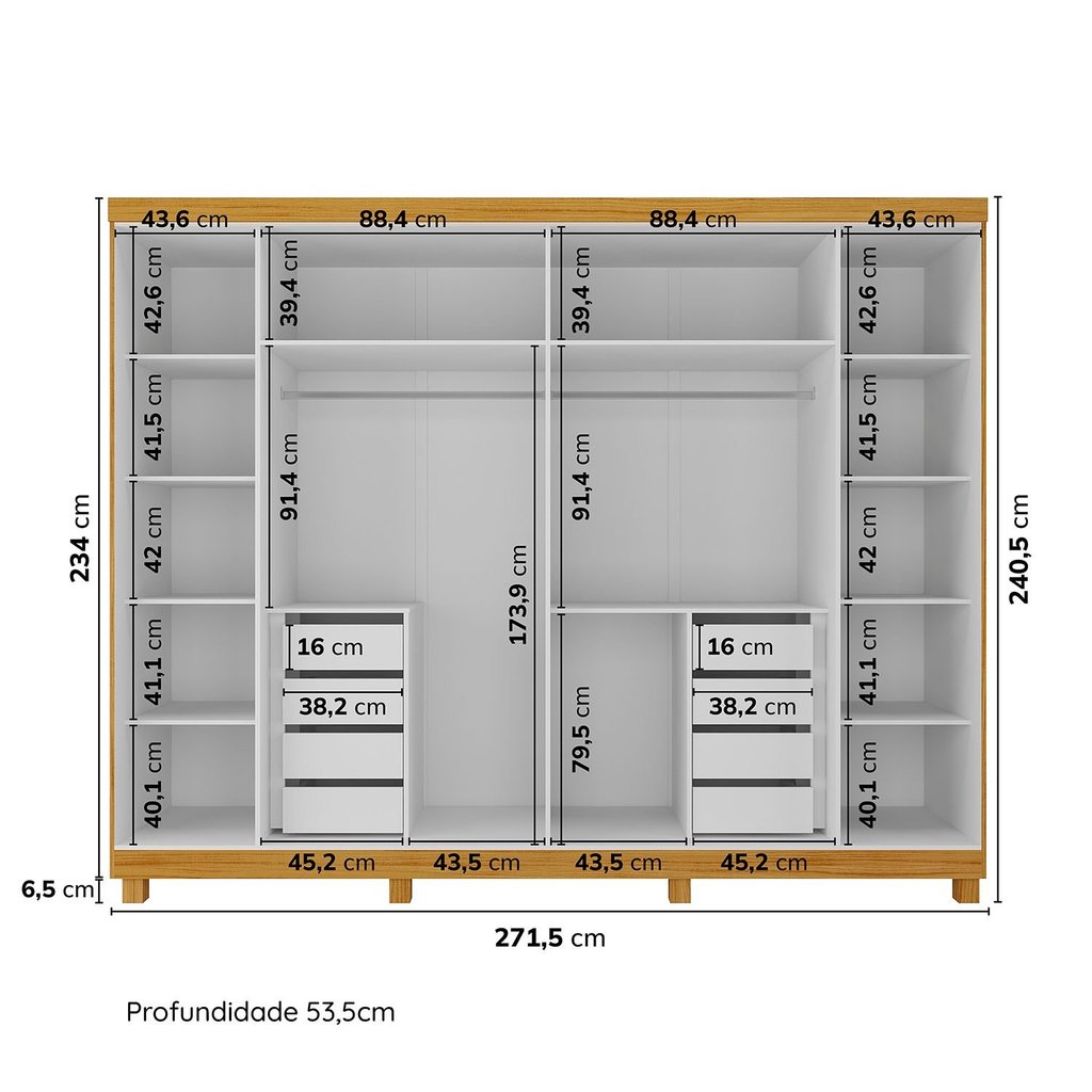 O Guarda-Roupa Casal 6 Portas Carnaúba Cabecasa une a imponência e resistência da árvore carnaúba com um design sofisticado e estrutura robusta. Produzido em chapa de MDF de 15mm, semelhante à marcenaria tradicional, possui seis portas e espelhos integrados que ampliam e iluminam o ambiente. Seu interior é meticulosamente planejado para oferecer ampla organização, com gavetas equipadas com corrediças telescópicas e prateleiras e cabideiros espaçosos. Os puxadores modernos e a estrutura sólida garantem sofisticação, durabilidade e uma solução prática e estilosa para suas necessidades de armazenamento. Estilo: Moderno Modular: Não Peso (kg): 255 Garantia: 12 Meses Altura (cm): 240.5 Largura (cm): 271.5 Possui Pés: Não Cor da Porta: Off White Possui Gancho: Não Possui Nichos: Não Possui Portas: Sim Tipo de Porta: Bater Porta Janelada: Não Possui Gavetas: Sim Suporta Até (kg): 155 Tipo de Gaveta: Interna Possui Espelhos: Sim Profundidade (cm): 53 Escala de Brilho: Semi-Fosco Gaveta com Chave: Não Possui Calceiros: 1 Possui Capelinha: Não Possui Sapateira: Não Material da Porta: MDF Origem do Produto: Nacional Possui Cabideiros: Sim Possui Iluminação: Não Ambiente Principal: Quarto Fabricação Própria: Sim Formato do Espelho: Retangular Material da Gaveta: MDF Material Principal: MDF Possui Penteadeira: Não Possui Prateleiras: Sim Acabamento da Porta: Pintura UV Material do Puxador: MDF Sapatas Niveladoras: Não Acabamento da Gaveta: Pintura UV Tipo de Guarda-roupa: Casal Espessura do Fundo (mm): 3 Material da Prateleira: MDF Peso Máximo por Gaveta: 5 Possui Espelho Interno: Não Quantidade de Espelhos: 02 Espelhos com Tamanhos Iguais Espessura das Portas (mm): 15 Acabamento da Prateleira: Pintura UV Tipo de Puxador da Porta: Externo Escala de Brilho da Porta: Semi-Fosco Espessura da Estrutura (mm): 15 Tipo de Puxador da Gaveta: Não Possui Escala de Brilho da Gaveta: Brilhante Peso Máximo por Prateleira: 5 Tipo de Corrediça da Gaveta: Telescópica Espessura das Prateleiras (mm): 15 Material do Puxador da Porta: MDF Possui Organizador de Gaveta: Não Escala de Brilho da Prateleira: Brilhante Espessura do Fundo das Gavetas (mm): 3 Possui Espaço para Vestidos Longos: Sim Tipo de Dobradiça/Corrediça da Porta: Metálica Marca: CabeCasa MadeiraMadeira Cor Flex: Não Cor Interna: Off White Cor do Produto: Naturale/Off White Itens Inclusos: 01 unidade do produto + 01 manual de montagem Cor Predominante: Marrom Linha ou Coleção: Carnaúba Cor do Puxador: Marrom Quantidade de Cabideiros: 02 Cabideiros Quantidade de Prateleiras: 12 Prateleiras Quantidade de Portas: 6 Portas Quantidade de Gavetas: 08 Gavetas Quantidade de Portas com Espelhos: 2 Portas com Espelho