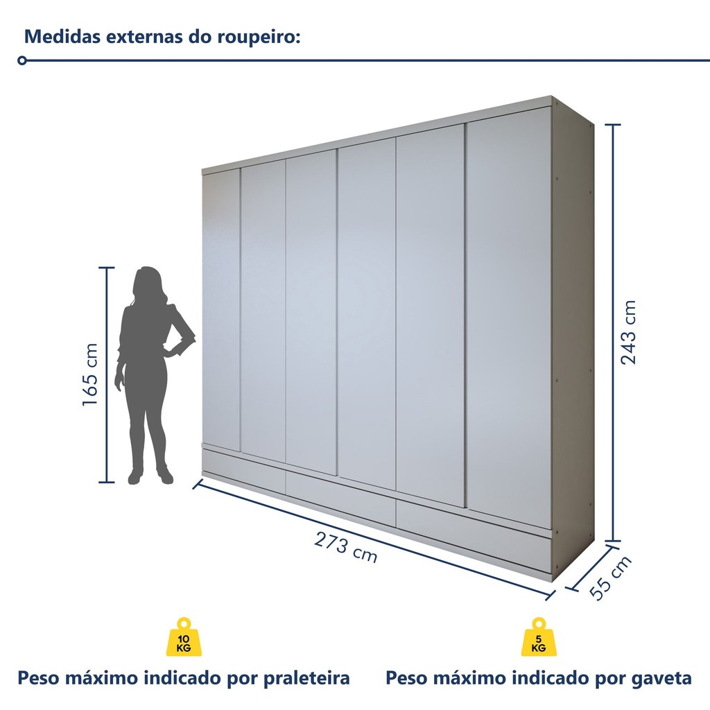 Apresentamos o guarda-roupa perfeito para quem busca espaço e estilo! Com estrutura 100% MDF e puxadores embutidos, ele oferece um visual moderno e acabamento impecável, tanto interno quanto externo. Por ser um guarda roupa de casal, seu espaço interno é grande, com prateleiras bem distribuídas, 6 gavetas internas, 3 gavetas externas com corrediças telescópicas, além de espaço para roupas longas, cabideiros e calceiro em alumínio. As dobradiças de pressão garantem maior durabilidade, e o acabamento semi-brilho com textura completa o visual sofisticado! É um guarda roupa grande? Sim, é um guarda roupa com 6 portas amplas. Como limpar um guarda roupa de MDF? Deve ser limpo com flanela limpa e seca. Estilo: Moderno Modular: Não Peso (kg): 249 Garantia: 03 Meses Altura (cm): 243 Acabamento: Impressão Largura (cm): 273 Possui Pés: Não Cor da Porta: Branco Possui Gancho: Não Possui Portas: Sim Tipo de Porta: Bater Porta Janelada: Não Possui Gavetas: Sim Suporta Até (kg): 125 Tipo de Gaveta: Interna Possui Espelhos: Não Profundidade (cm): 55 Escala de Brilho: Fosco Gaveta com Chave: Não Possui Calceiros: Não Possui Sapateira: Sim Material da Porta: MDF Origem do Produto: Nacional Possui Cabideiros: Sim Ambiente Principal: Quarto Material da Gaveta: MDF Material Principal: MDF Possui Prateleiras: Sim Acabamento da Porta: Impressão Acabamento da Gaveta: Impressão Tipo de Guarda-roupa: Casal Espessura do Fundo (mm): 3 Material da Prateleira: MDF Peso Máximo por Gaveta: 5 Possui Espelho Interno: Não Espessura das Portas (mm): 15 Acabamento da Prateleira: Impressão Tipo de Puxador da Porta: Embutido Escala de Brilho da Porta: Fosco Espessura da Estrutura (mm): 15 Tipo de Puxador da Gaveta: Não Possui Escala de Brilho da Gaveta: Fosco Peso Máximo por Prateleira: 10 Tipo de Corrediça da Gaveta: Metálica Telescópica Espessura das Prateleiras (mm): 15 Material do Puxador da Porta: MDF Possui Organizador de Gaveta: Não Escala de Brilho da Prateleira: Fosco Espessura do Fundo das Gavetas (mm): 3 Possui Espaço para Vestidos Longos: Sim Tipo de Dobradiça/Corrediça da Porta: Telescópica Marca: Josandro Cor: Branco Cor do Produto: Branco Itens Inclusos: 1 Guarda Roupa, Kit Ferragens e Manual de Montagem Cor Predominante: Branco Cor do Puxador: Branco Quantidade de Cabideiros: 03 Cabideiros Quantidade de Prateleiras: Não Possui Quantidade de Portas: 6 Portas Quantidade de Gavetas: 09 Gavetas