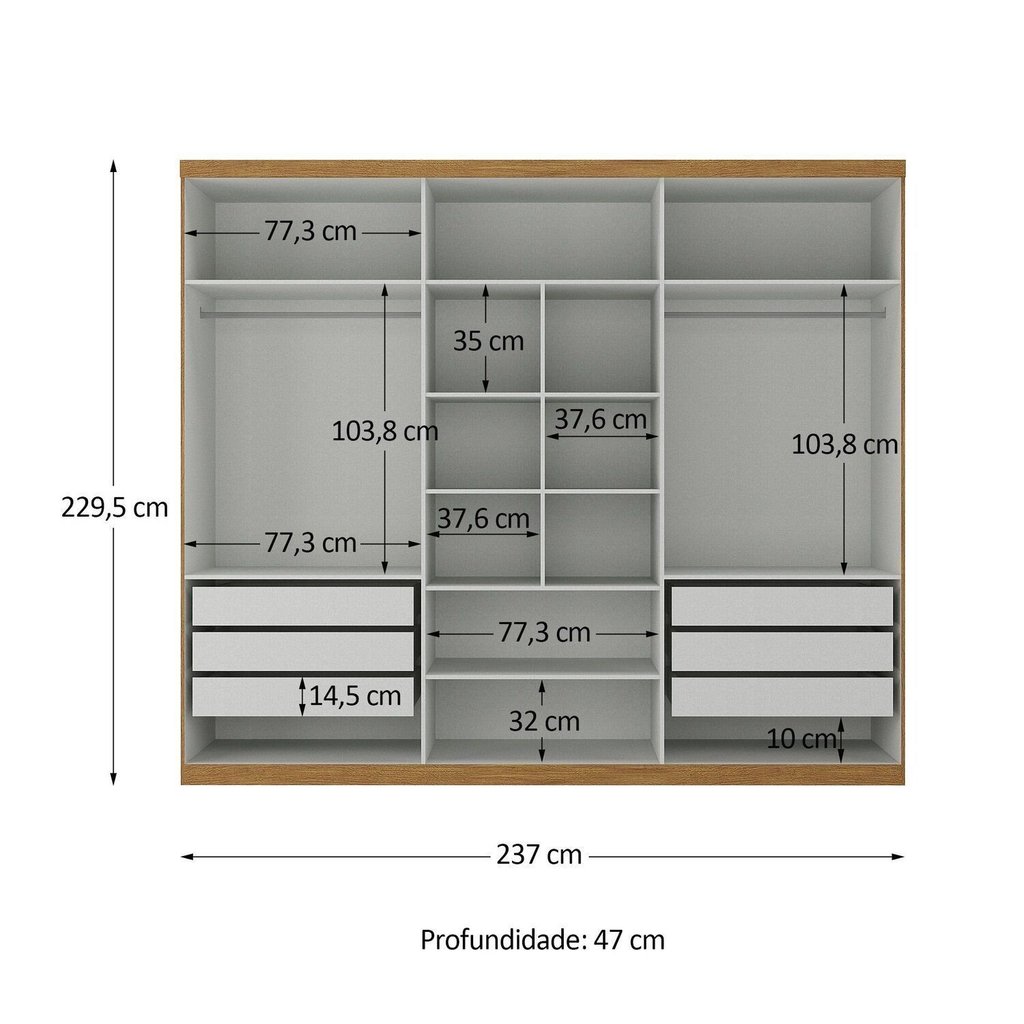 O Guarda Roupa Monte Carlo possui: Amplo espaço interno com divisórias ele e ela; Gavetas com corrediças telescópicas; Cabideiros em alumínio; Puxador perfil em alumínio. O Guarda Roupa Monte Carlo é perfeito para você que busca espaço e versatilidade para seu dia a dia. Estilo: Moderno Modular: Não Peso (kg): 168.1 Garantia: 03 Meses Altura (cm): 229.5 Largura (cm): 237 Possui Pés: Não Possui Portas: Sim Tipo de Porta: Bater Possui Gavetas: Sim Tipo de Gaveta: Interna Possui Espelhos: Não Profundidade (cm): 47 Escala de Brilho: Brilhante Possui Calceiros: Não Material da Porta: MDP Origem do Produto: Nacional Possui Cabideiros: Sim Ambiente Principal: Quarto Material da Gaveta: MDP Material Principal: MDP Possui Prateleiras: Sim Acabamento da Porta: Pintura UV Acabamento da Gaveta: Pintura Tipo de Guarda-roupa: Casal Espessura do Fundo (mm): 3 Material da Prateleira: MDP Peso Máximo por Gaveta: 3 Espessura das Portas (mm): 15 Acabamento da Prateleira: Pintura Tipo de Puxador da Porta: Externo Escala de Brilho da Porta: Brilhante Espessura da Estrutura (mm): 12 Tipo de Puxador da Gaveta: Não Possui Peso Máximo por Prateleira: 7 Tipo de Corrediça da Gaveta: Metálica Telescópica Espessura das Prateleiras (mm): 12 Possui Organizador de Gaveta: Não Escala de Brilho da Prateleira: Fosco Espessura do Fundo das Gavetas (mm): 3 Tipo de Dobradiça/Corrediça da Porta: Metálica Marca: Maxel Cor Interna: Cinza Cor: Cinamomo/Off White Cor do Produto: Cinamomo / Off White Itens Inclusos: 1 Guarda-Roupa e Manual de Montagem Cor Predominante: Off White Linha ou Coleção: Monte Carlo Quantidade de Portas: 6 Portas Quantidade de Gavetas: 06 Gavetas