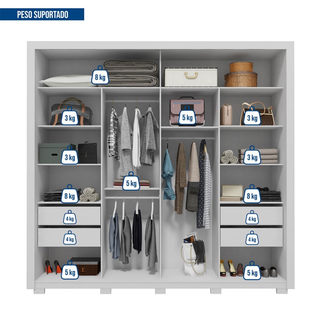 Dimensões: - Altura: 233,70 cm - Largura: 245,00 cm - Profundidade: 55,50 cm - Peso: 186,000 kg Descrição: O(a) Guarda-Roupa Casal Castellana 2 Portas 4 Gavetas com Espelho Branco - Pnr Móveis é produzido em MDP na escala de brilho Fosco, e possui um grau de dificuldade de montagem: Difícil. Seu revestimento/acabamento é: Pintura UV. Infelizmente a Loja não oferece serviço de montagem, deixamos essa informação bem clara em todas as nossas páginas de produto. Onde especificamos que os móveis chegarão desmontados, e que a montagem fica por conta do cliente. Como não oferecemos esse serviço não embutimos o mesmo no preço dos produtos, ou seja, maior economia para você! Todos os nossos móveis também acompanham o manual de montagem, e caso você queira, pode realizar a montagem você mesmo, sempre especificamos os graus de montagem dos produtos. Nos casos de grau baixo e médio, com pouco ou nenhum conhecimento, você mesmo pode efetuar a montagem, e fazer essa economia. Apenas nos graus de montagem alto, recomendamos a contratação de um montador com experiência, visto que são montagens mais complicadas. A montagem é feita com Parafusos, cavilhas e Minifix.. Este móvel é indicado para que seja utilizado no(a) Quarto, dando um toque especial no cômodo de sua casa. Para que você mantenha seu produto sempre em ótimo estado, recomendamos que use apenas um pano seco ou levemente umedecido, sem o uso de quaisquer produtos abrasivos. A Loja garante aos clientes, 90 dias de garantia nos produtos, porém, recomendamos que entre em contato com o fornecedor/marca do produto, pois o mesmo(a), pode garantir um prazo maior de garantia. Lembrando ainda que: quaisquer objetos decorativos que aparecem nas imagens, não acompanham o produto. Características: - Espessura da Estrutura: 12mm, 15mm - Possui Gavetas?: Sim - Quantidade de Gavetas: 4 - Peso Suportado nas Gavetas (Kg): 3 Kg - Material das Corrediças: Metálica - Tipo da Corrediça: Telescópica - Possui Portas?: Sim - Quantidade de Portas: 2 - Material da Porta: MDP e MDF - Espessura da Porta: 15 mm - Tipo de Porta: Portas de Correr - Material do Trilho: Alumínio/Plástico - Possui Vidro?: Sim - Vidro Temperado?: Não - Possui Espelho?: Sim - Altura do Espelho: 108 Cm - Largura do Espelho: 37 Cm - Espessura do Espelho: 0,3 Cm - Possui Prateleiras?: Sim - Quantidade de Prateleiras: 7 - Peso Suportado nas Prateleiras:: 3 Kg - Possui Puxadores?: Sim - Material do Puxador: MDF - Possui Ripamento?: Sim - Tipo de Ripado: Frisado - Linha ou Coleção: Castellana - Montagem Invertida?: Não Pode ser Montado Invertido - É frágil?: Não - Possui Nicho?: Não - Material da Estrutura: MDP - Escala de Brilho: Fosco - Possui Rodízios?: Não - Possui Pés?: Sim - Pés com regulagem de altura?: Não - Quantidade de Pés/Sapatas: 10 - Material dos Pés: Plástico - Acompanha: Guarda Roupa + Kit Ferragens + Manual de Montagem - Acompanha Manual de Montagem: Sim - Como os Móveis Chegarão na Minha Casa: Desmontado em caixas, acompanhado de todas as peças, ferragens e manuais para montagem. - Grau de Dificuldade da Montagem: Difícil - Necessita de Montagem: Sim - Sistema de Montagem: Parafusos, cavilhas e Minifix. - Garantia (dias): 90 - Indicação de Uso: Quarto - Observação: Objetos decorativos que aparecem nas imagens, não acompanham o produto. - Recomendação de Manutenção: Utilizar pano levemente umedecido, seguido de pano seco. Não utilizar quaisquer produtos abrasivos. - Revestimento /Acabamento: Pintura UV - Modelo: Casal - Quantidade de Cabideiros: 3 - Tipo de Guarda-Roupa/Closet: Convencional