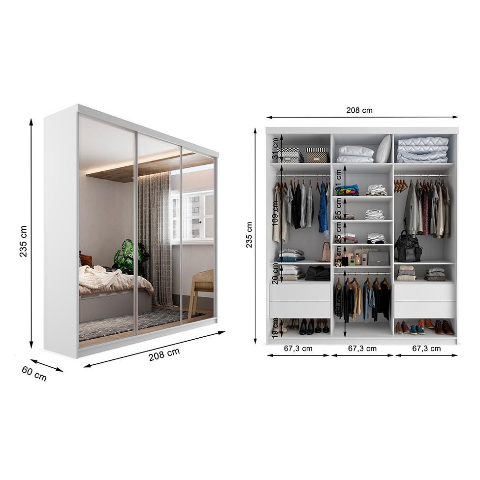 Que tal o Guarda-Roupa Geneve? Com visual elegante, o Guarda-Roupa Geneve encherá seu dormitório de sofisticação. Com 3 portas e 4 gavetas, ele é perfeito para o quarto de casal, já que tem ótimo espaço para ser compartilhado e cada um organizar tudo à sua maneira. Feito em materiais resistentes e duráveis, o móvel tem portas de correr e espelho de corpo inteiro, assim você otimiza o espaço no cômodo e ainda garante que o look esteja sempre em dia. Ah, as portas contam com sistema anti descarrilhamento. Perfeito, né? Cor: Branco Garantia em Meses: 3 Cores do Produto: Branco Instruções/Cuidados: Limpeza com pano levemente umedecido Conteúdo da Embalagem: 1 Guarda-Roupa - Entregue em: 6 Volumes Modelo: Geneve Número de Volumes: 6 Material: O Guarda-Roupa Geneve possui estrutura em MDF 15 mm, espelho comum 3 mm, trilhos em alumínio, corrediças telescópicas, puxadores em alumínio, cabideiro em alumínio e acabamento fosco Material para Filtro: MDF Descrição do Tamanho: Altura: 235 cm | Largura: 208 cm | Profundidade: 60 cm Altura do Produto (cm): 235 Largura do Produto (cm): 208 Comprimento do Produto (cm): 60 Peso do Produto (Kg): 160 Produto precisa de Montagem?: Sim, sugerimos a contratação do nosso serviço de montagem (para os CEPs em que o serviço está disponível) ou de algum profissional experiente de sua preferência Tipo de Guarda-Roupas: Casal Número de portas: 3 Número de gavetas: 4 Número de Prateleiras: 9 Material da dobradiça/trilho da porta: Alumínio Material da estrutura: MDF Material do cabideiro: Alumínio Material do fundo: HDF Material do puxador: Alumínio Necessita fixação na parede: Não Possui espelho/vidro: Sim Tipo da Corrediça da gaveta: Telescópica Tipo de Porta: Correr PROFUNDIDADE x LARGURA x ALTURA: 60 x 208 x 235 Fornecedor: RR Industria e Comercio de Moveis LTDA Baterias são necessárias?: Não Certificação de teste externa: Não Componentes incluídos: Não Is Fragile: Não Número da peça: Não Inclui manual de montagem: Sim Inclui Manual de Montagem: Sim